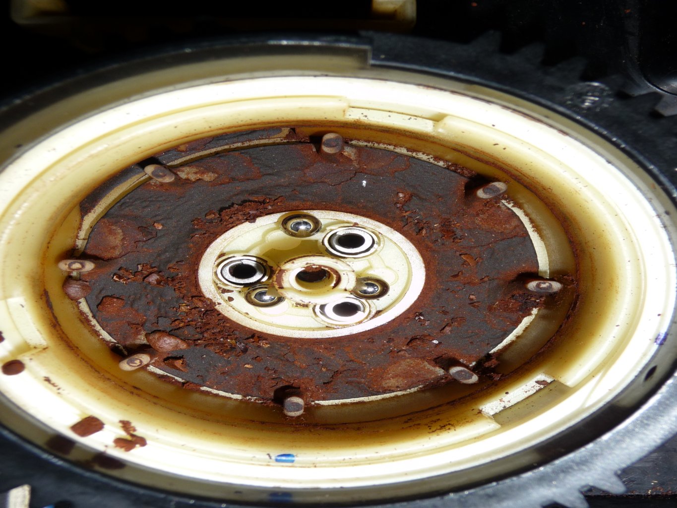 Bovenstaande plastic ring, met de 3 verticale veren, wordt aangedreven door de elektrische motortje er onder en die 3 kogels vallen in gaatjes van een plaat gemonteerd aan de onderkant van de maalmolen “loper”, waardoor deze gaat roteren (zodra en zo lang de motor draait).