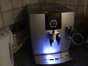 Eine S9 - an der hatte jemand fürchterlich herumgebastelt: Hier war nichts mehr an seinem Platz. Kein Wunder, dass die Kiste nicht funktioniert hat. Ich habe das Ding komplett auseinander gebaut, sodass ich nur noch den Korpus vor mir hatte. Und dann: Tropfblech neu, Tassenablage neu, Innenverteilermanschette + alle anderen Dichtungen neu, die beiden Silikonschläche vor der Pumpe neu, Flowmeter gereinigt, Pumpe neu, Membranregler neu, beim MV ging nix mehr - selbst mit roher Gewalt war es nicht zu öffnen - es musste ein revidiertes rein. Die Thermoblöcke waren wiedererwartend dicht und funktionsfähig - die hab' ich dann mal in Ruhe gelassen. Vermutlich war zumindest der TB Wasser (TB96) bei knapp 14.000 Bezügen nicht der erste.. Zu guter letzt natürlich BG und DV sowie Keramikventil überholt, das Mahlwerk gereinigt und nagelneue V5-Mahlsteine rein. War das ein geiler, erster Kaffee, sag' ich euch!