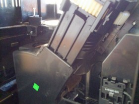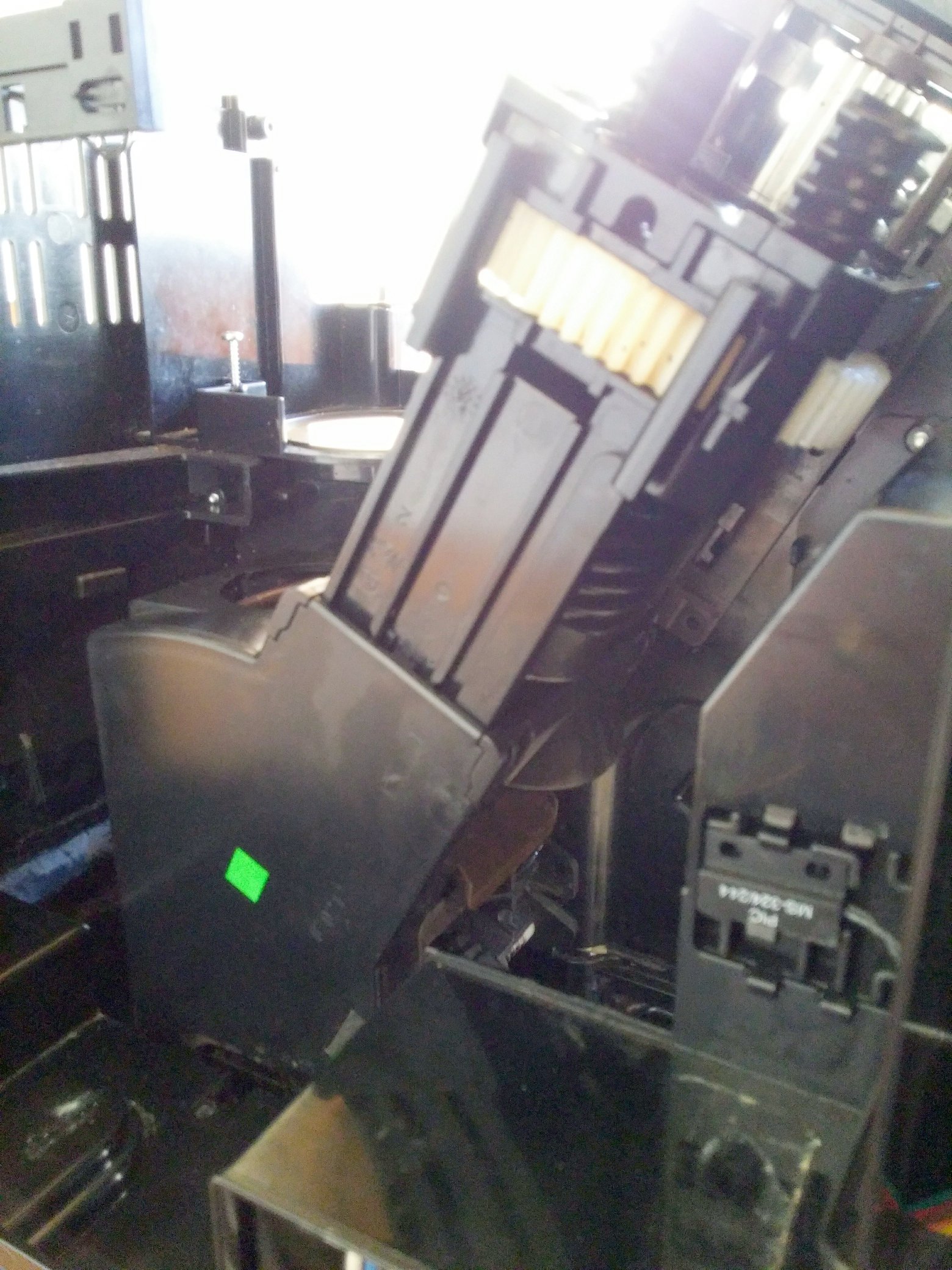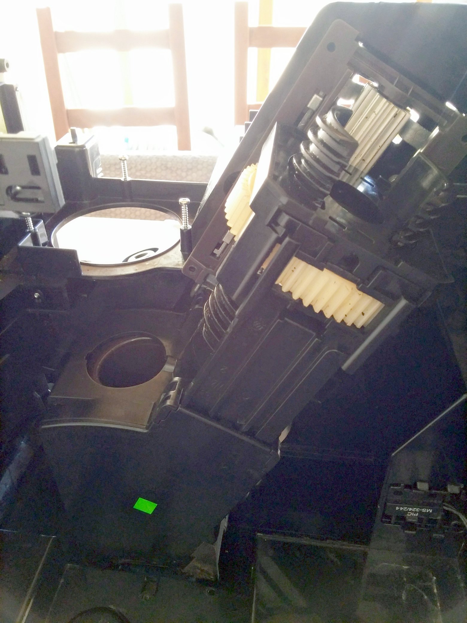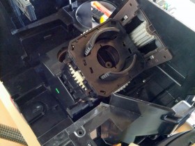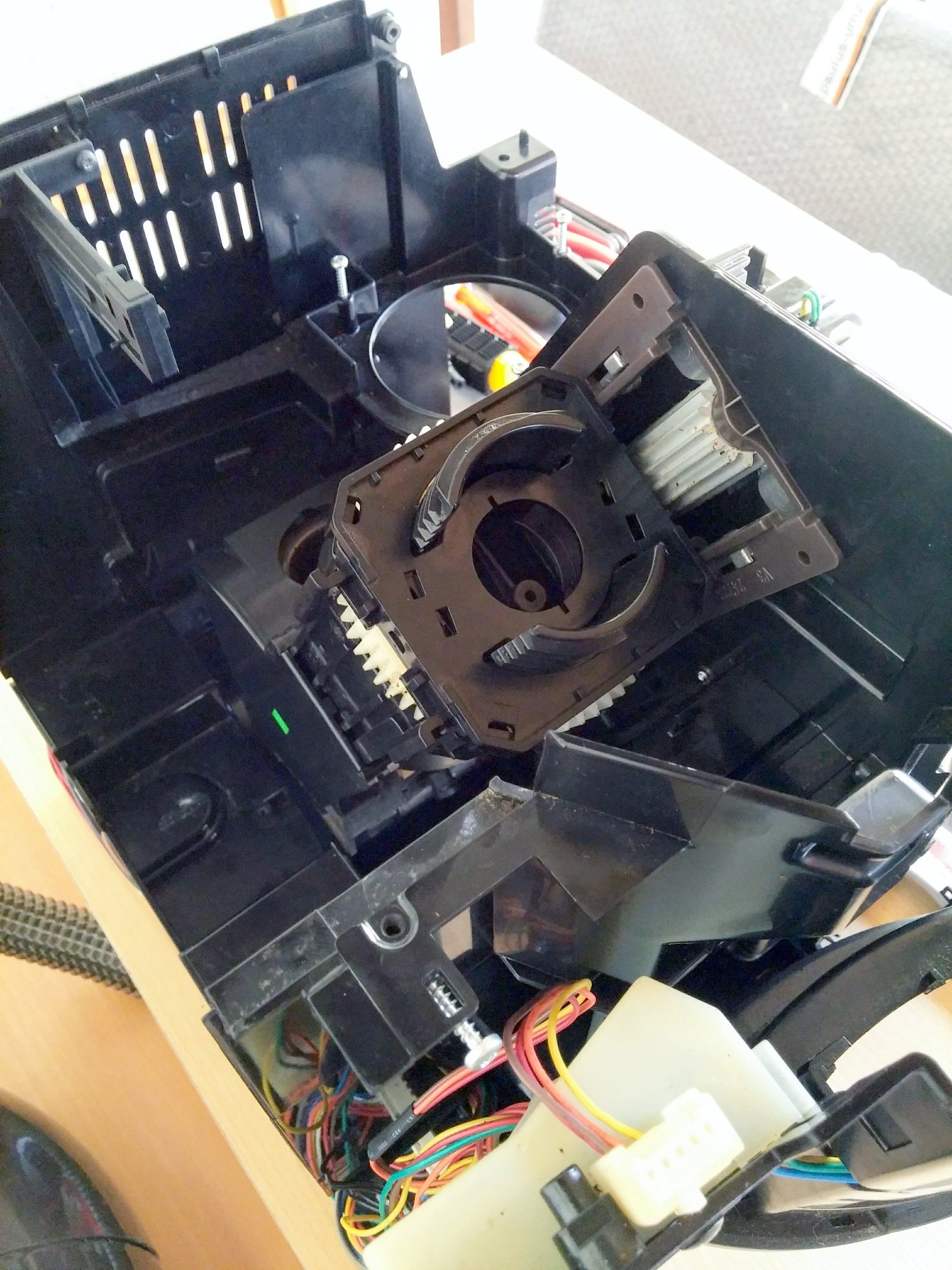 Die BG scheint irgendwie an dem hinterliegenden weißen Antriebszahnrad zusammengeschraubt zu sein? Oder die beiden Führungsschienen vorne müssen weg? Die Schrauben der beiden Führungen habe ich gelöst, die Schienen bekomme ich aber nicht heraus. Alles andere an der BG (Deckel usw.) wurde demontiert.