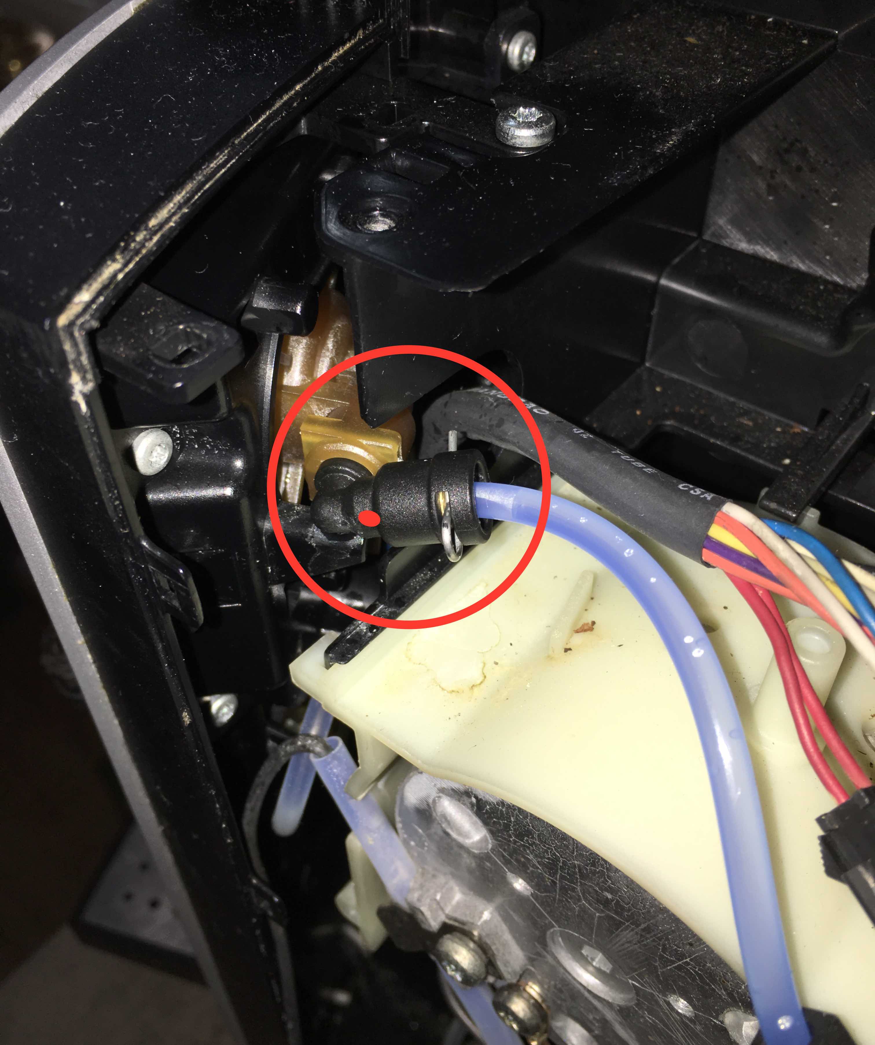 Sie war an einigen Stellen undicht und der Milchschäumer war auch ohne Funktion. Nachdem ich aber die Brüheinheit, das Drainageventil und das Auslaufventil gereinigt und alle Dichtungen ausgetauscht habe, lief alles wie am Schnürchen. Bis ich heute Mittag festgestellt habe, dass aus der rechten Seite der Maschine ein sehr feiner Wasserstrahl kommt (das Gehäuse habe ich noch nicht wieder angebaut). Beim Spülvorgang bzw. beim Kaffee ziehen kommt aus dem schwarzen Winkel, der den Schlauch abgehend vom Thermoblock und das Ventil hinter dem Hahn für den Dampf-/ Heisswasserbezug verbindet (siehe Foto). Wenn ich jedoch Dampf/Heisswasser beziehe ist der Strahl nicht da. Ich habe den Winkel ausgebaut, kann aber mit bloßem Auge kein Loch erkennen.