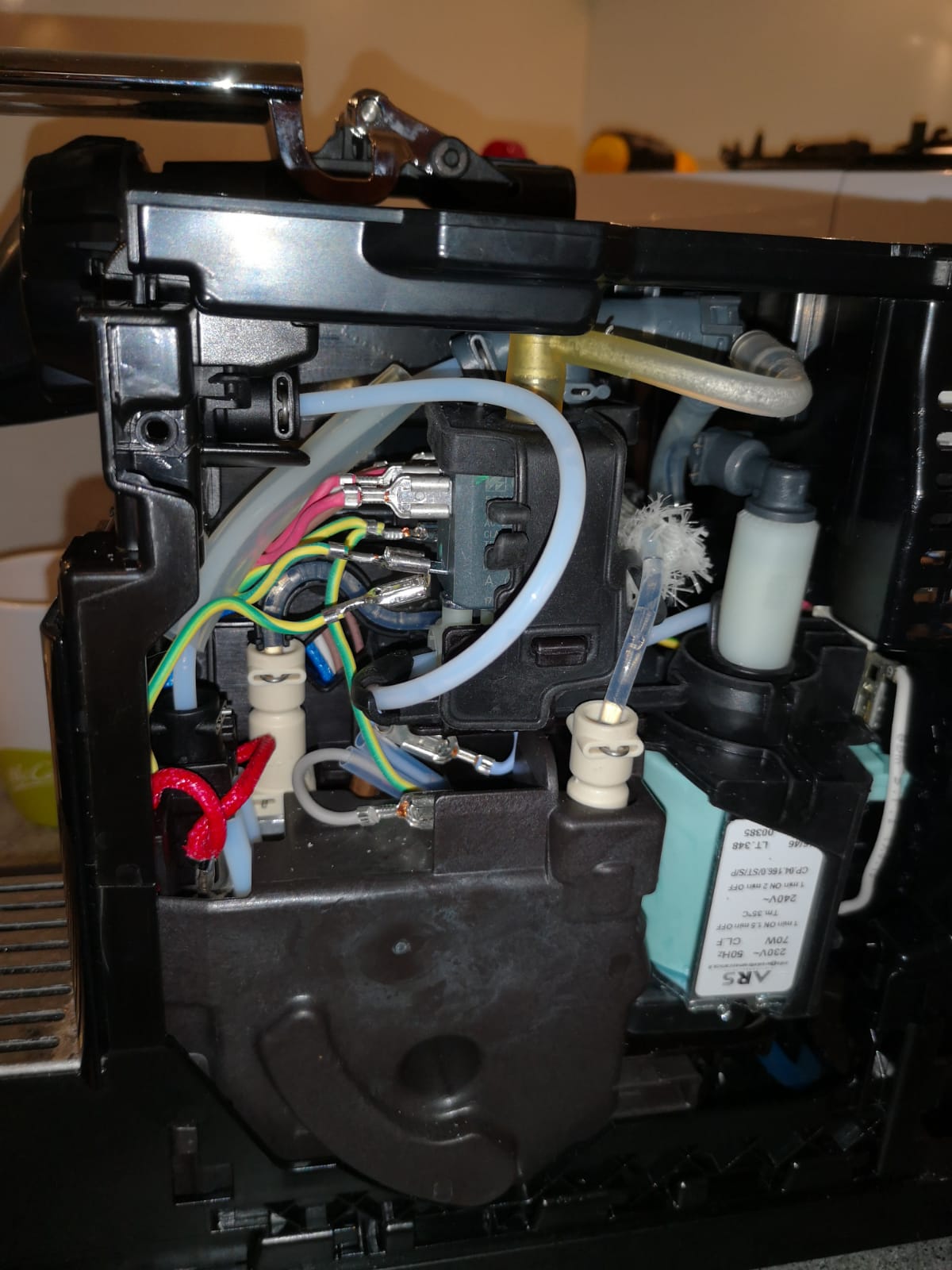 Auf dem Bild ist das Magnetventil hinter dem Gummi. Rechts kommt das Wasser durch den Schlauch und links sollte es hoch zur Milchschaumdüse fließen. Ganz oben drauf fließt es dann aber ab und landet im Auffangbehälter.