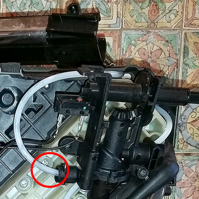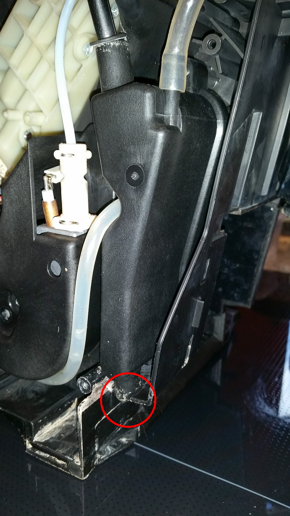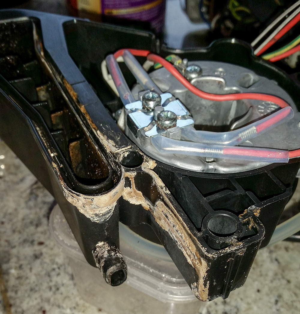 Habe dann den Thermoblock ausgebaut und den Behälter, der daran befestigt ist, gereinigt. Also das Dingen, aus dem das Wasser in die Schale tropfen soll.