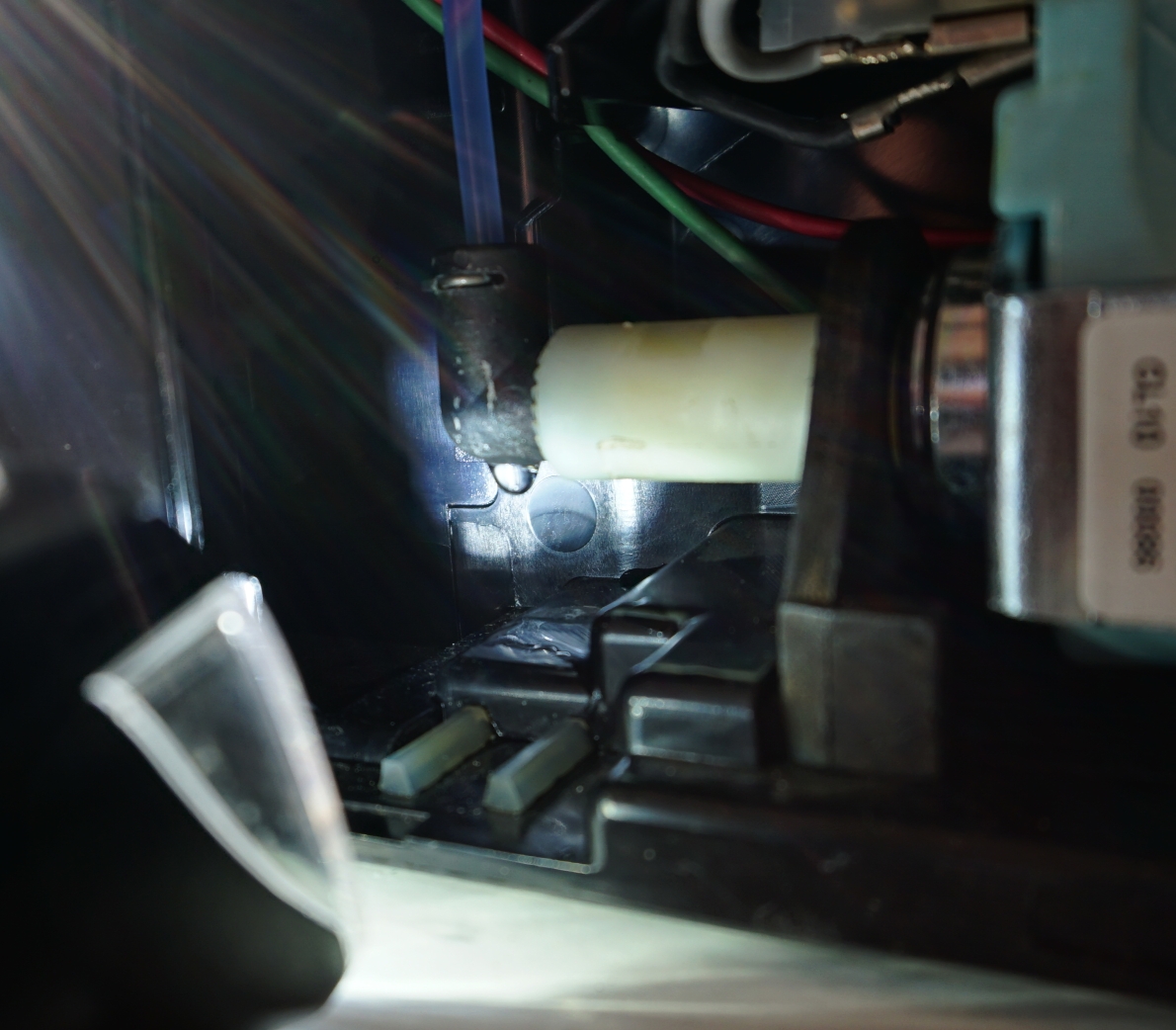 jetzt tropft Wasser links neben der Pumpe. Und zwar unten aus dem schwarzen Winkel raus. Die Anschlussstelle vom Schlauch ist dicht.