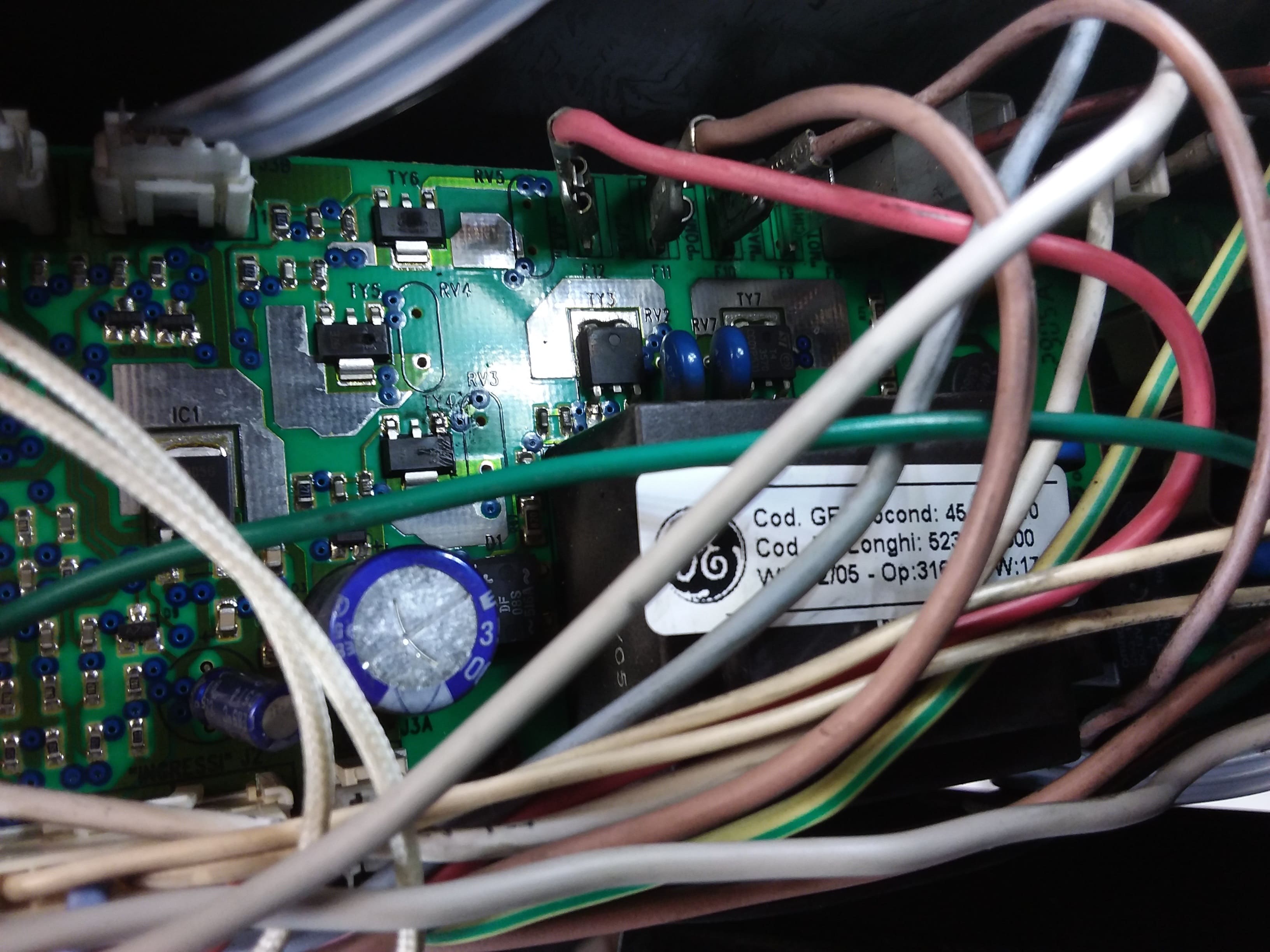 Zum optischen Zustand später etwas mehr. Nach einigem Probieren habe ich herausgefunden wenn ich die Klemme für "MACINA" abziehe, bleibt der FI drin. Die Maschine geht an und heizt auch. Klingt aber nicht gut, sie brummt richtig (wie ein lautes Netzbrummen) Nach optischer Inspektion der Platine, denke ich das TY4 durchgebrannt ist, laut goo..le ist das aber der Triac für die Pumpe.