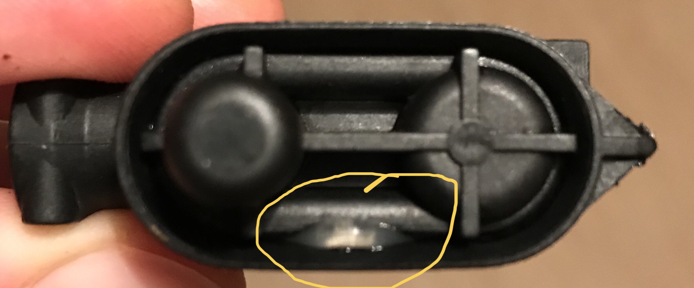 Mir ist noch aufgefallen, dass die Dichtung am Drainageventil rausgedrückt wurde (siehe Markierung auf dem Foto).