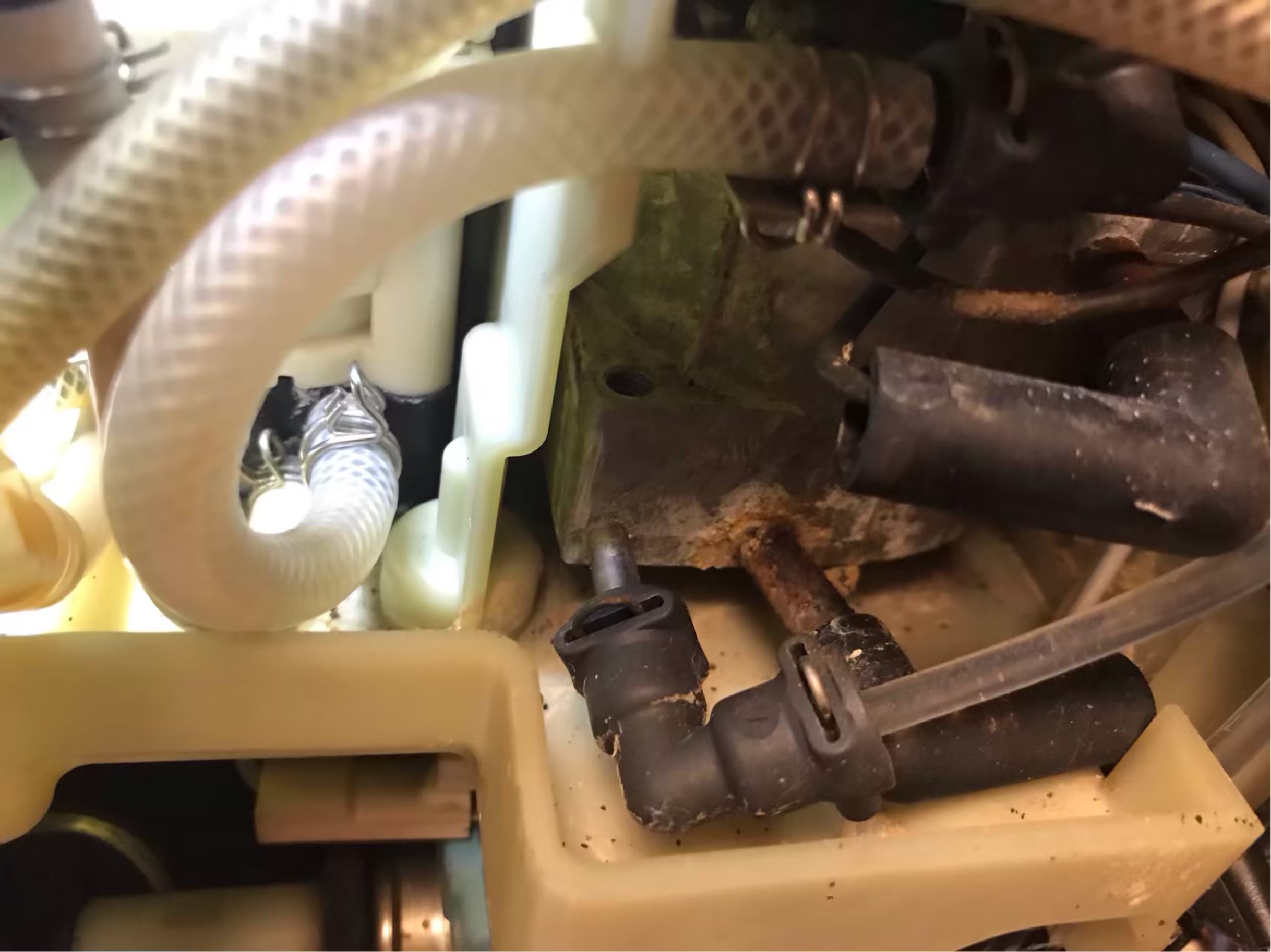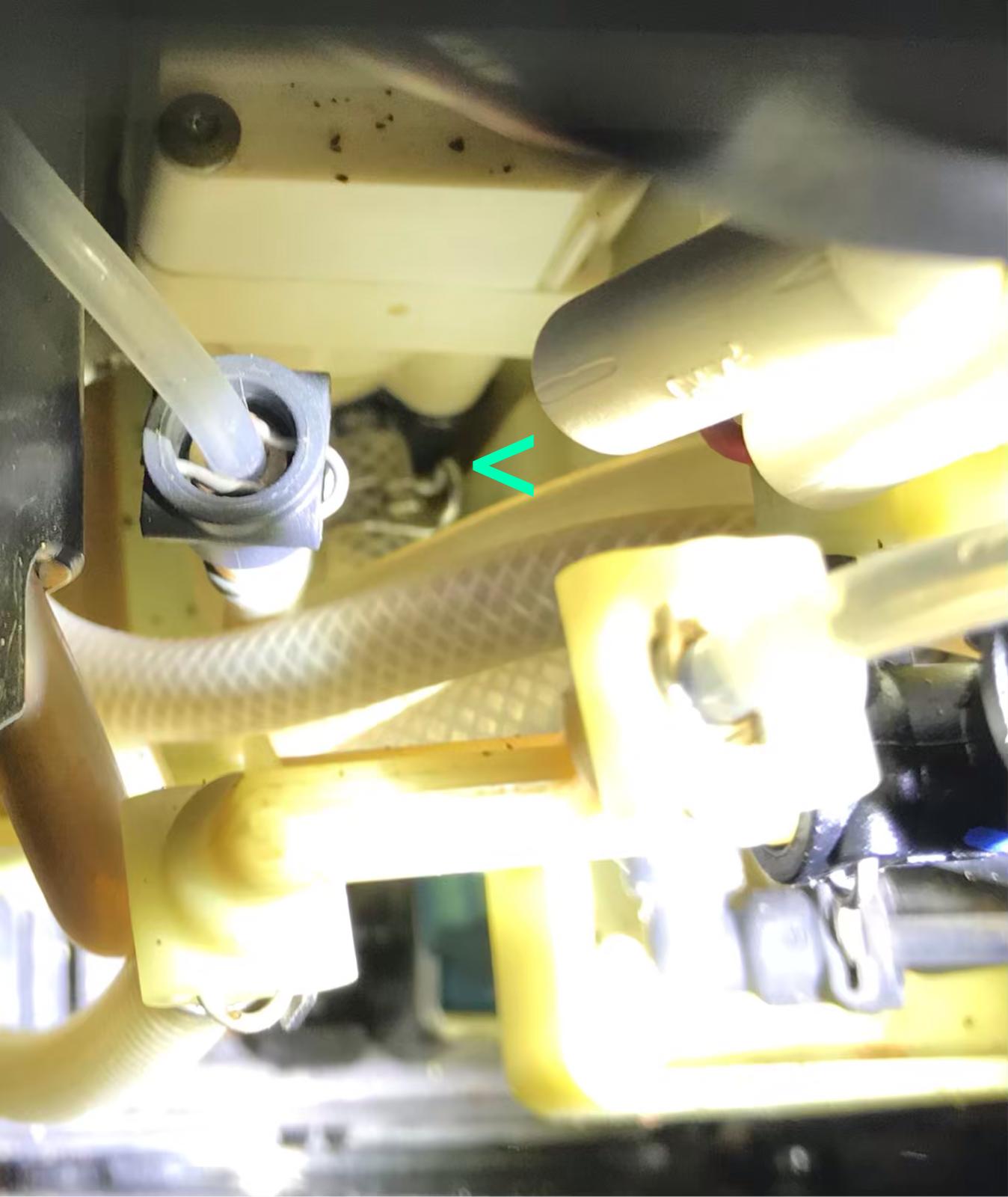 habe mal das Gerät oben geöffnet und konnte ziemlich weit unten beim Kaffee ziehen beobachten das etwas Wasser austritt. Leider habe ich den Schlüssel noch nicht erhalten das ich die Rückwand öffnen kann, aber der kommt. Ob das schon der Fehler sein kann, das ist ziemlich weit unten bei so einen Teflon Schlauch. Siehe Foto. grüner Pfeil. Mir ist auch aufgefallen, das das Teil was das Wasser aufheizt, oben, ziemlich korrodiert ist. Sollte man sowas wechseln?