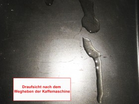 - In der Abtropfschale ist auch immer Flüssigkeit zu finden. Hierbei handelt es sich jedoch Kaffeegefärbte Flüssigkeit. Diese kommt aus der Tresterschublade / Wanne geflossen. (Sehr langsam. Ist auch nicht viel.) Es handelt sich jedoch nicht um Heruntertropfendes aus dem Kaffeeausguss. Ich weiß nicht, ob das normal ist.