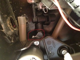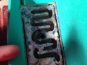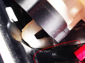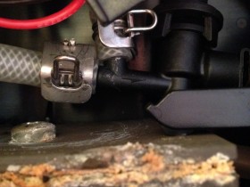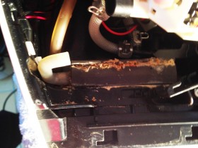 (Im Bild habe ich die Position des "Ein / Aus" Schalters mit einem roten Stift markiert. Wo genau es austritt kann ich nicht sagen. An dieser Stelle ist es mir das erste Mal aufgefallen) - Das Wasser ist klar. D.h. es handelt sich nicht um Kaffee sondern wirklich um Wasser.