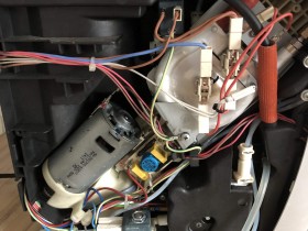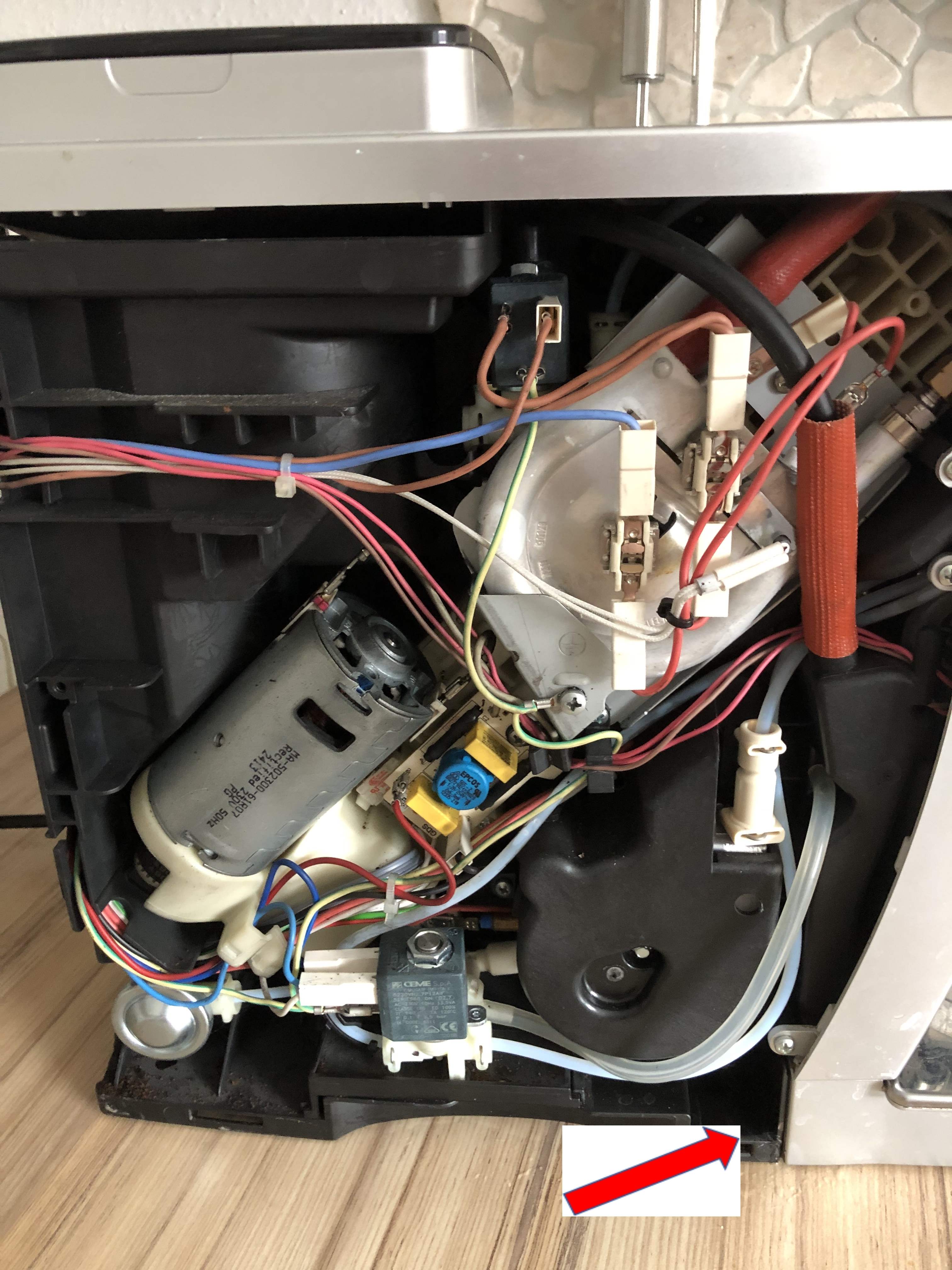 Leider habe ich das Problem auch nach Öffnen der Maschine nicht lokalisieren können. Das Wasser sammelt sich jedoch an der von der mir mit dem Pfeil gekennzeichneten Stelle.