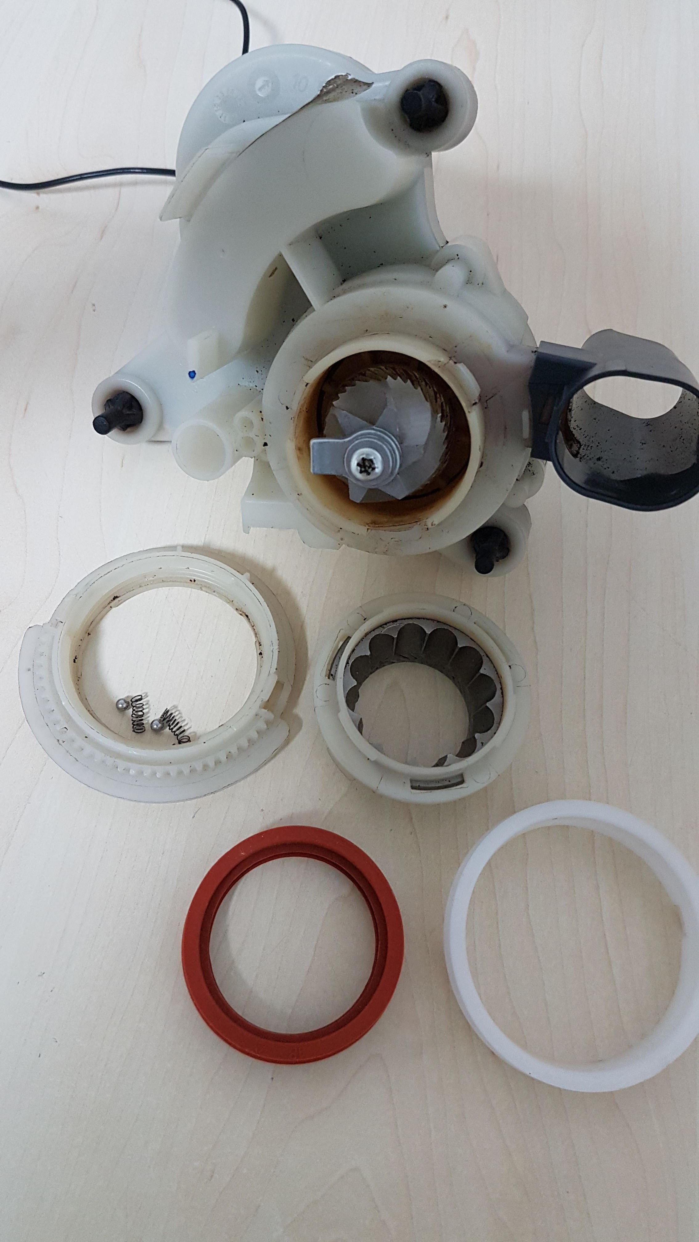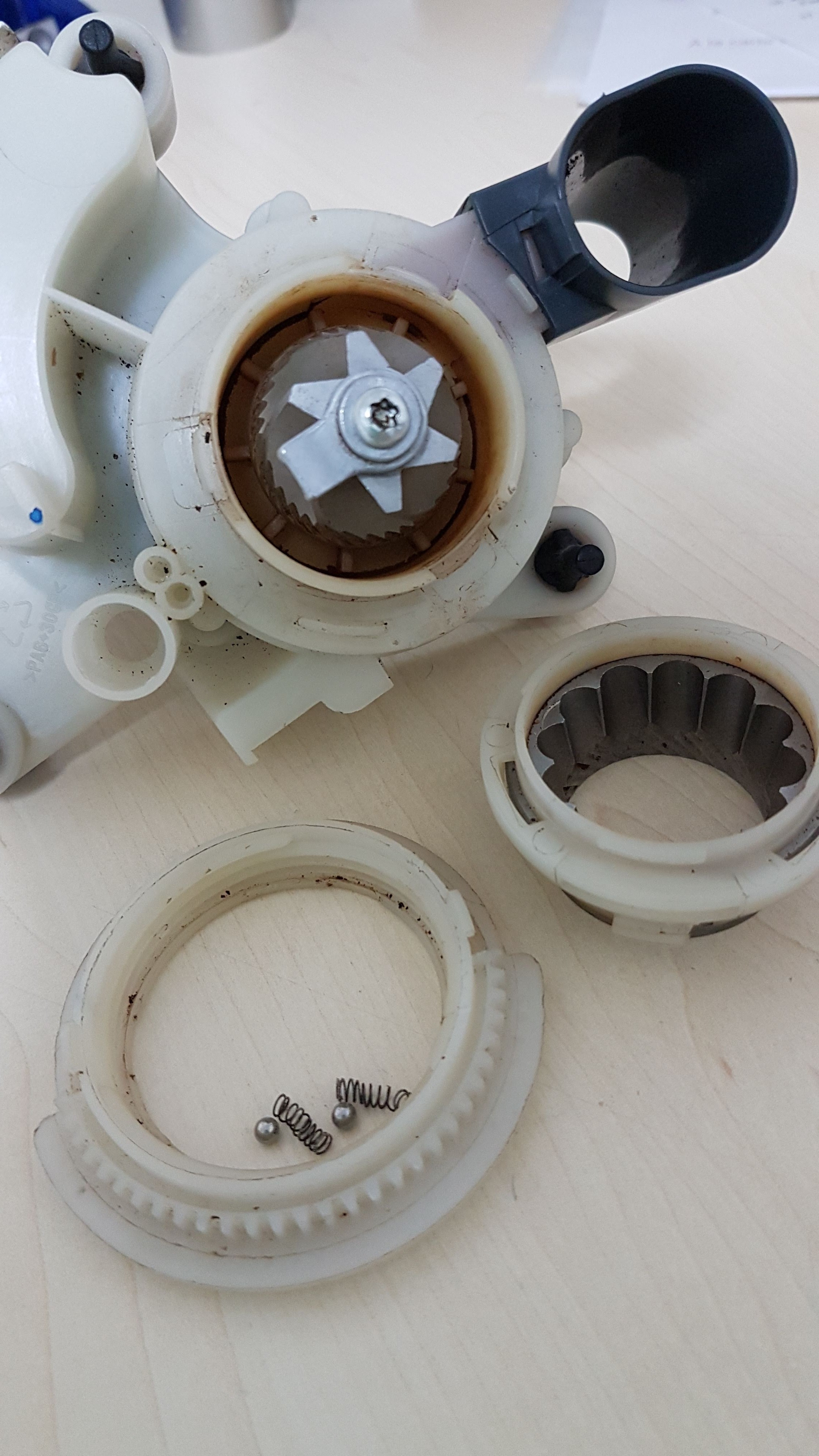 der unter teil mit den 2 kleinen kugeln und den Federn und der Ring mit den Zacken habe ich wieder zusammen am Mahlwerk. Wenn ich nach der Gebrauchsanleitung die ich im Forum Kaffeewelt runter geladen habe und den Mahlkegel einsetze, dann im Uhrzeigersinn drehe komme ich nicht weit mit dem drehen, wie etwas klemmen würde......... ?(