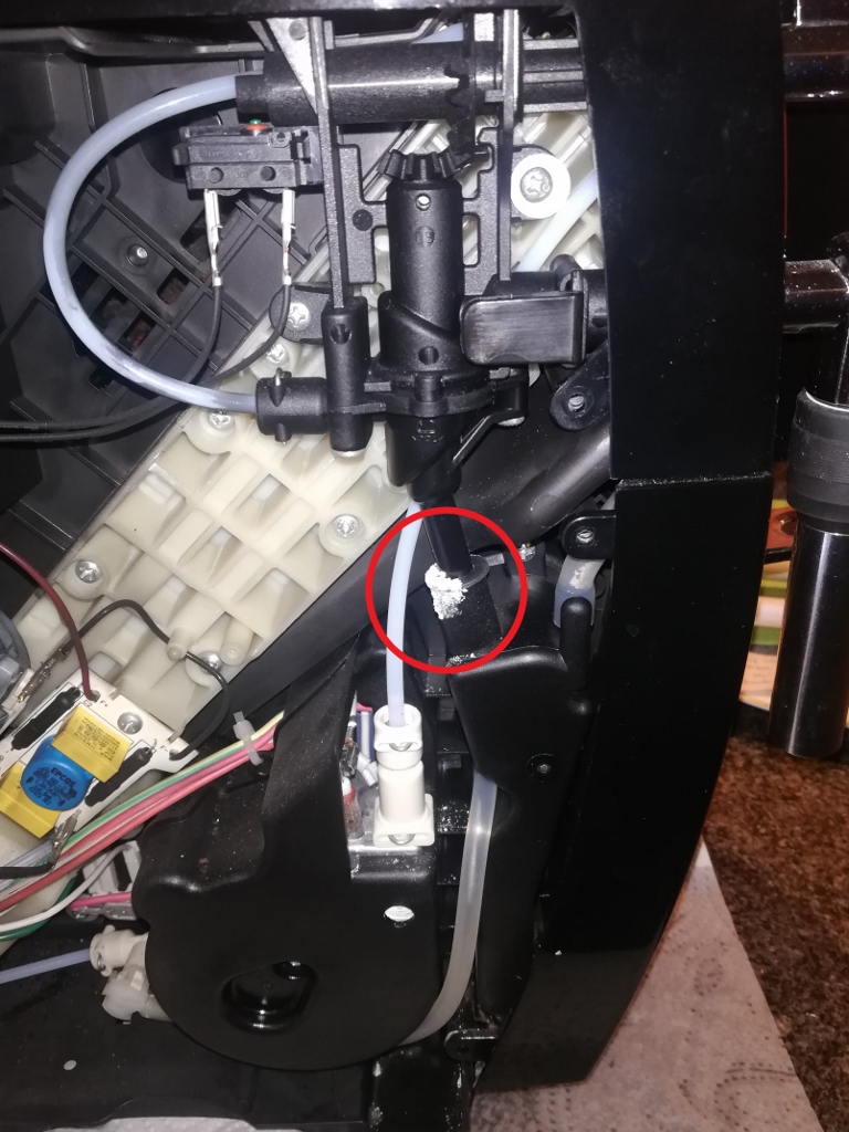 Konnte das Problem mittlerweile behoben werden? Ich steh nämlich vor demselben und außer der durchaus respektablen Kalkablagerung (siehe Kreis im angehängten Bild) sehe ich erstmal nichts Auffälliges. Während des Kaffeebezugs läuft heißes Wasser unterhalb des Aufschäumers in die Auffangschale, unter dem Gerät ist es danach allerdings völlig trocken. Die Brühgruppe zeigt augenscheinlich erstmal keine Probleme. Danke für die Hilfe!
