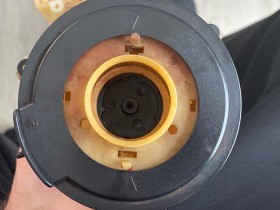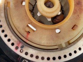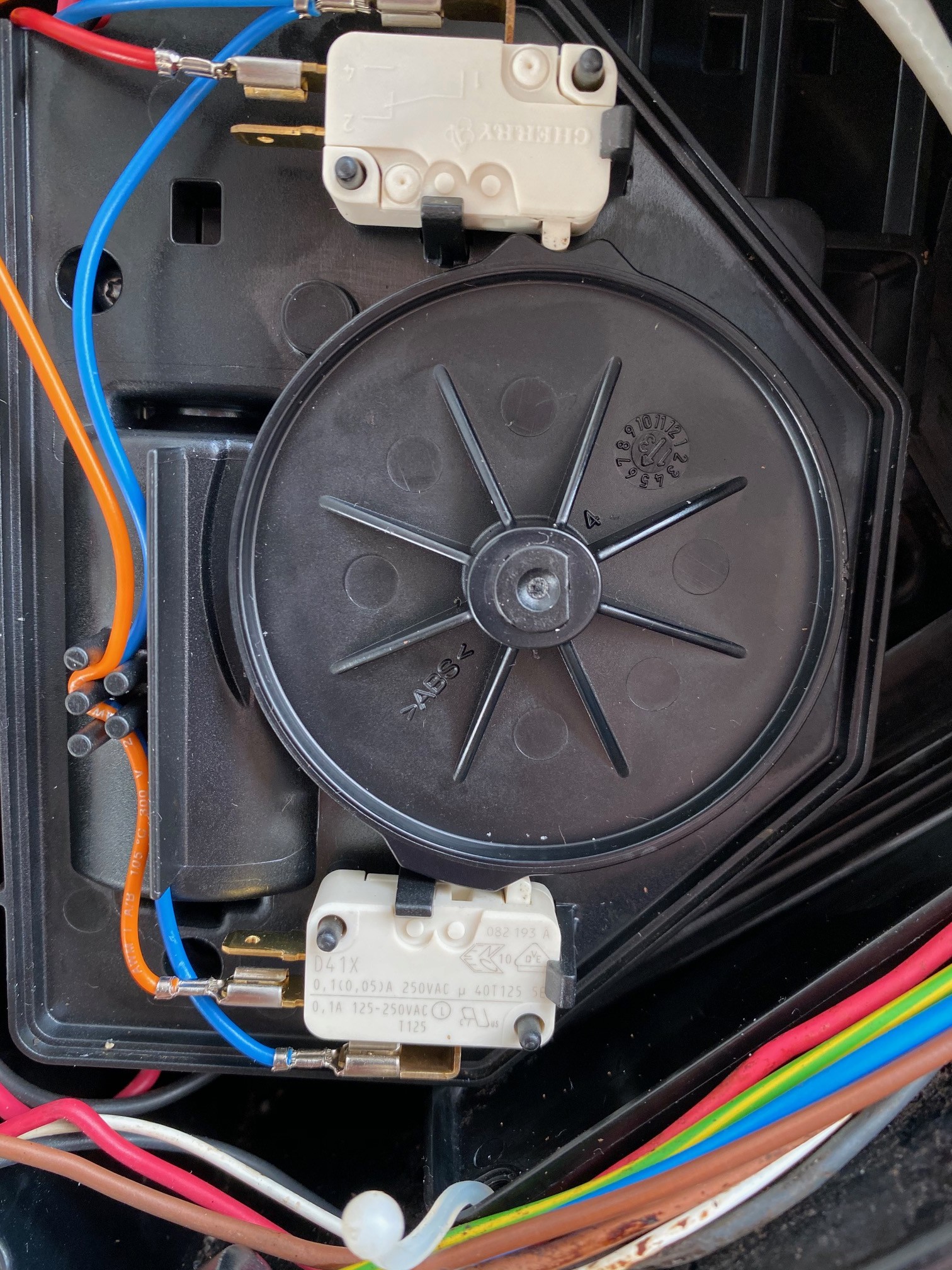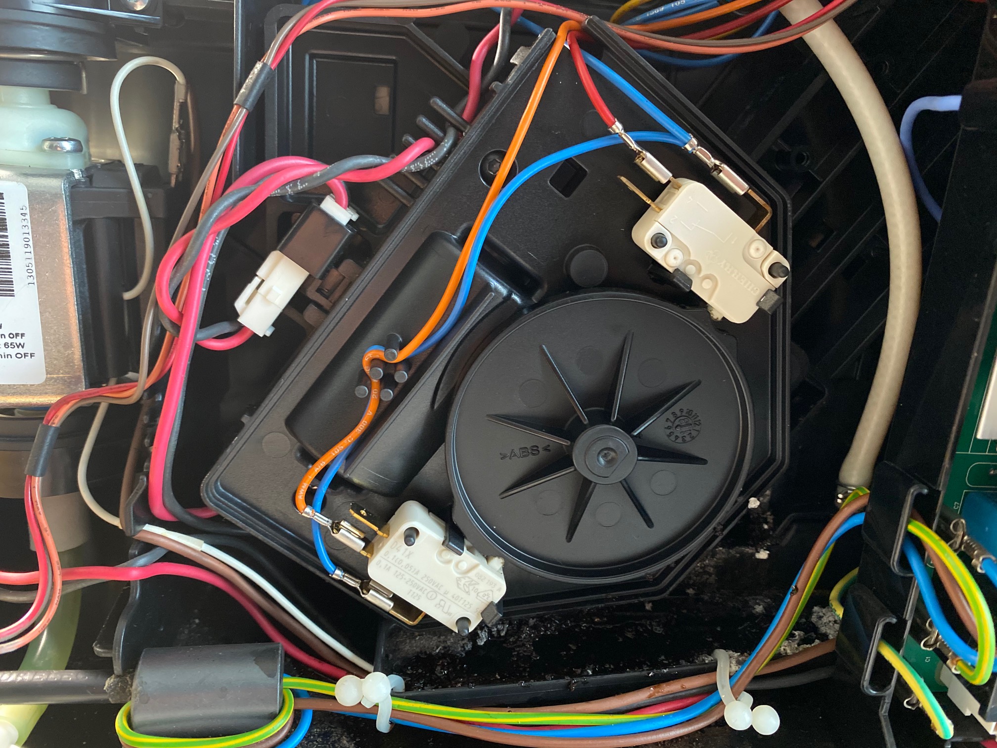 Mach am besten den Schlauch zum Drainageventil oben am Auslaufventil ab und zieh auch gleich beide Kabel vom Antrieb an der Elektronik ab. Auch der weiße Schlauch vom Keramikventil zur Expansionskammer sollte vorher ab.