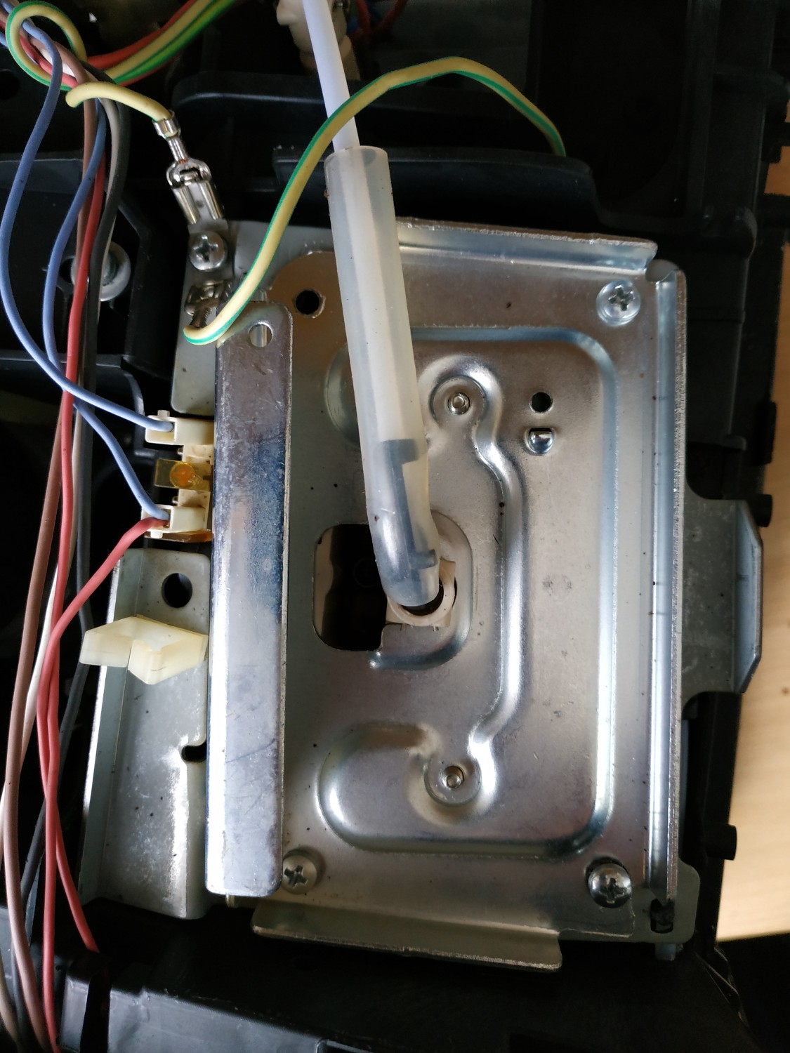 So, hab die Maschiene jetzt offen und hab es auch geschafft den Schlauch wieder auf zu stecken, nachdem ich die 4 Schrauben gelöst und ein paar Kabel abgemacht hatte. Leider ohne erfolg. Jetzt habe ich das Problem dass ich die Muttern, mit denen die die silberfarbene Platte befestigt war, nicht wieder festmaschen kann, da ich an die unterseite nicht herrankomme.