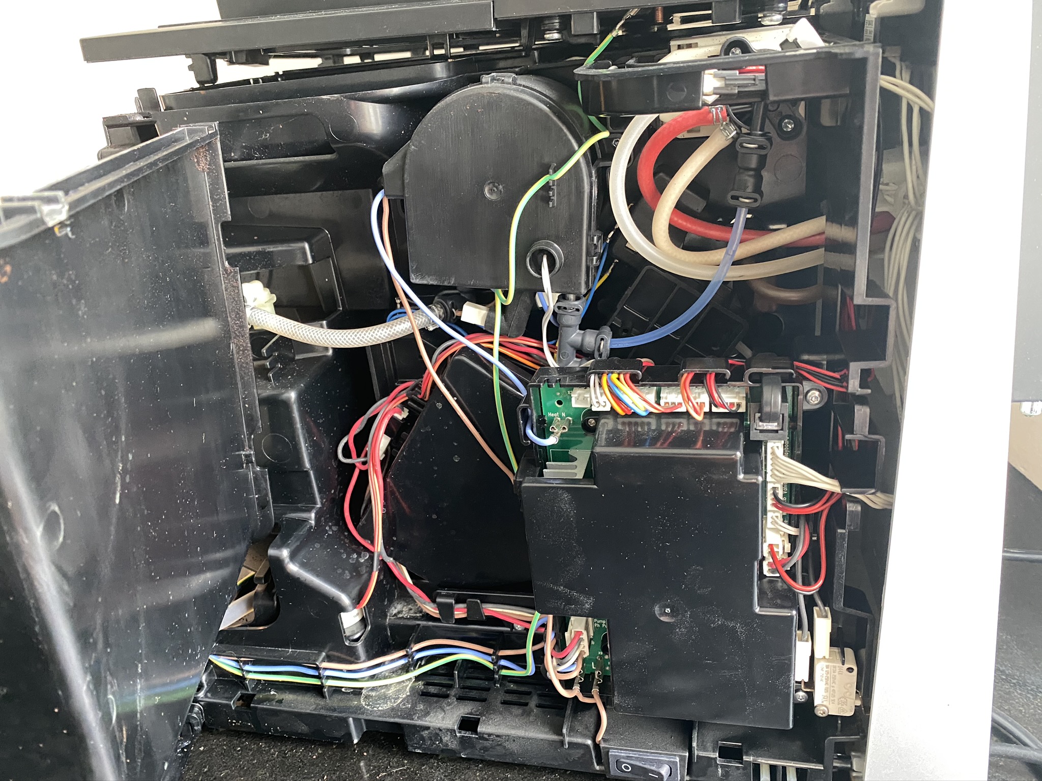 You need to reassemble the machine to a certain extent before you can run it more or less properly. You could keep the rear cover removed. If you keep the top cover removed, you need to put a magnet on the reed sensor for the powder lid and also keep the switch for the bean lid pressed. So installing the top cover is usually the faster way.