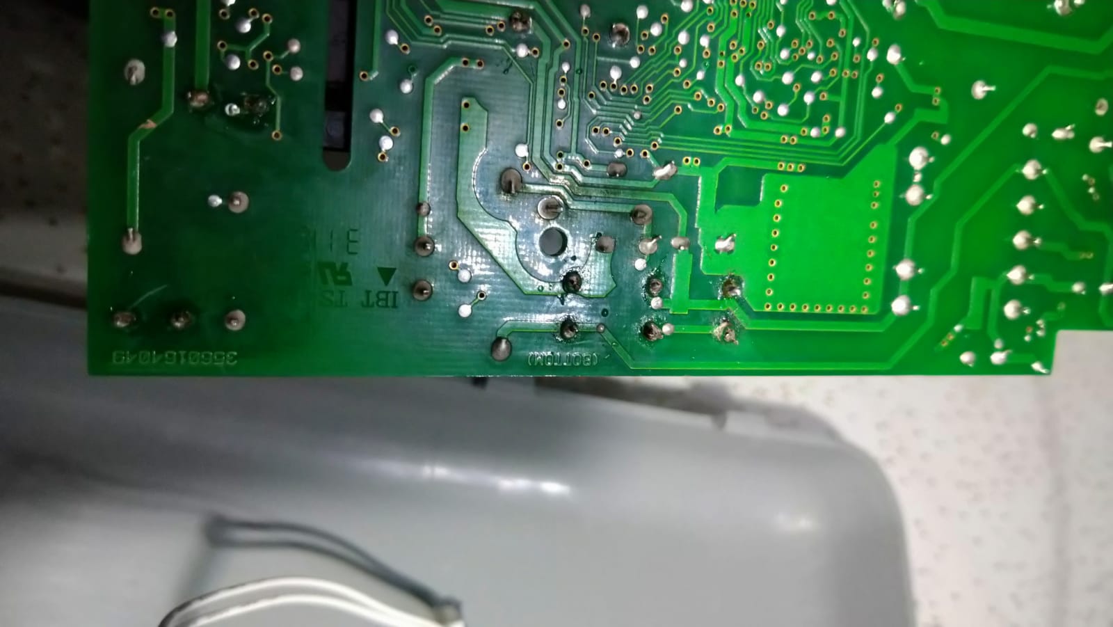 Anbei ein Foto der alten Hauptplatine: Irgendwo im markierten Bereich muss der Fehler liegen; dort in diesem 5-poligen Stecker kommt auch der Kontaktschalter der Tropfschale an...