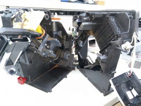 -Nun mehrere Schrauben lösen, die die beiden Gehäuse-Träger zusammen halten