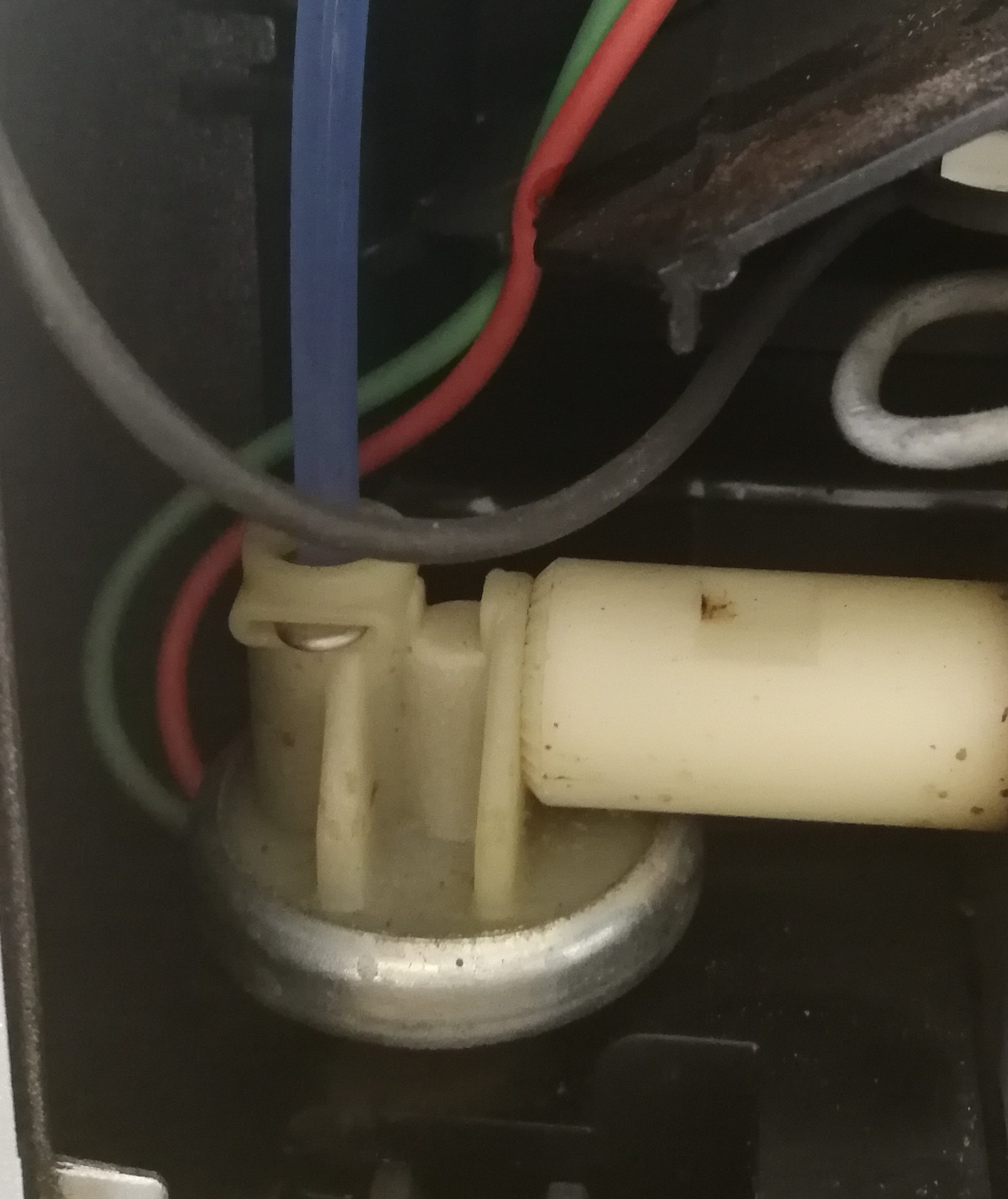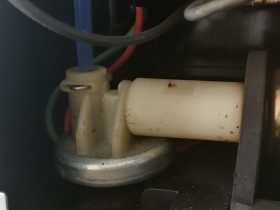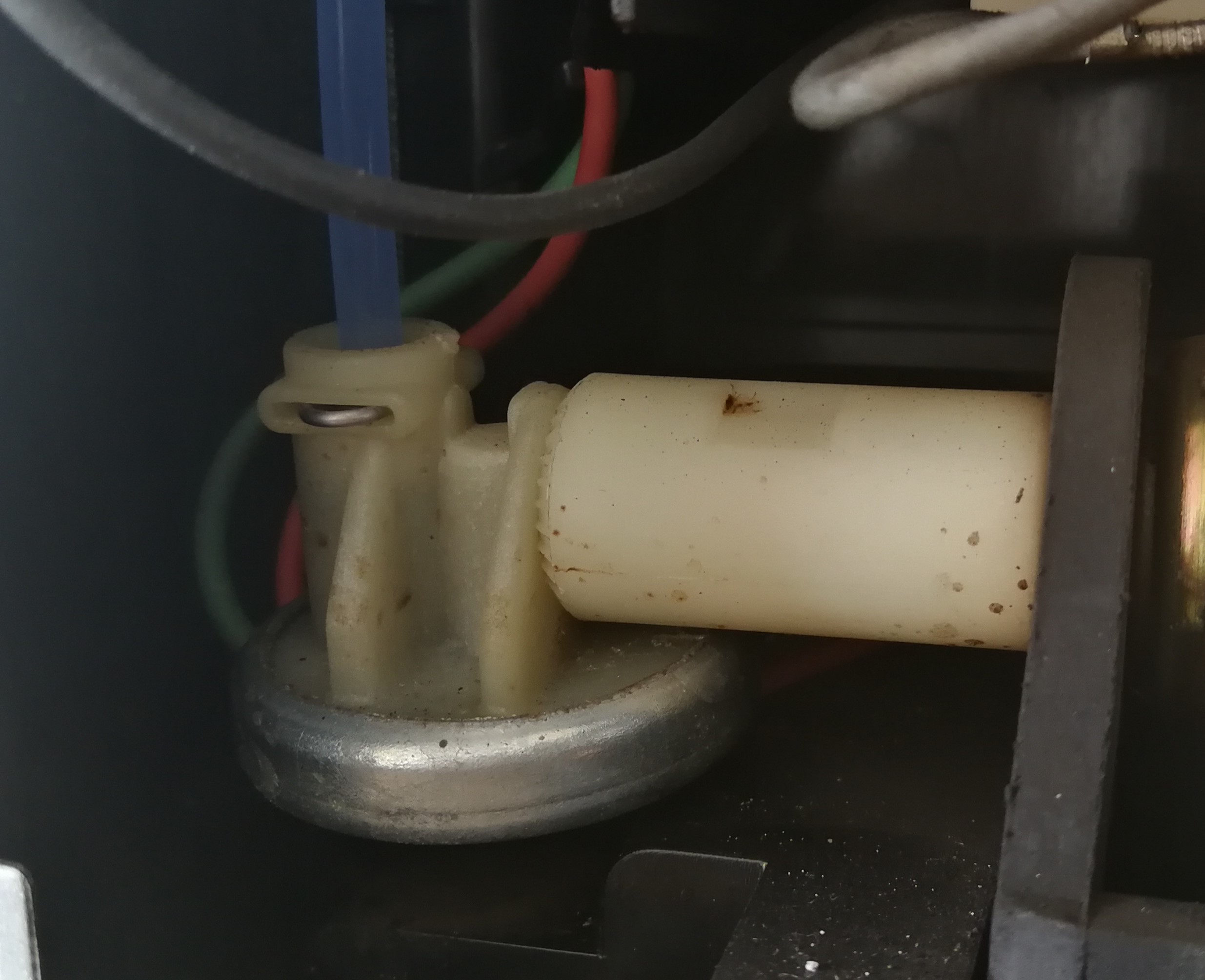 • Das ist der Schlauchanschluss Ausgang Membranregler. Da muss neu neue Dichtung rein. Der Mikroschalter für die Schalenerkennung sitz etwas versteckt. Man muss die hellgrau Plastik Halterung für die Magnetspule rausschrauben. Da hängt der Mikroschalter dran. Jetzt kann der Schalter mit einem Messgerät überprüft werden.