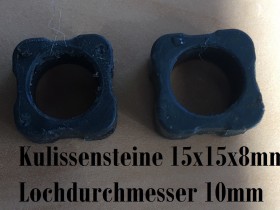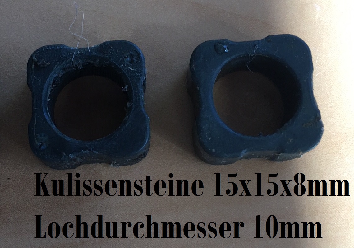 Hallo Community, ich suche aus einer Schlachtbrühgruppe von Siemens oder Bosch zwei Kulissensteine mit den Maßen 15x15x8mm, Lochdurchmesser 10mm. Wäre schön, wenn mir jemand für kleines Geld im Briefkuvert welche schicken könnte, die Brühgruppe ist ansonsten Top in Schuss.