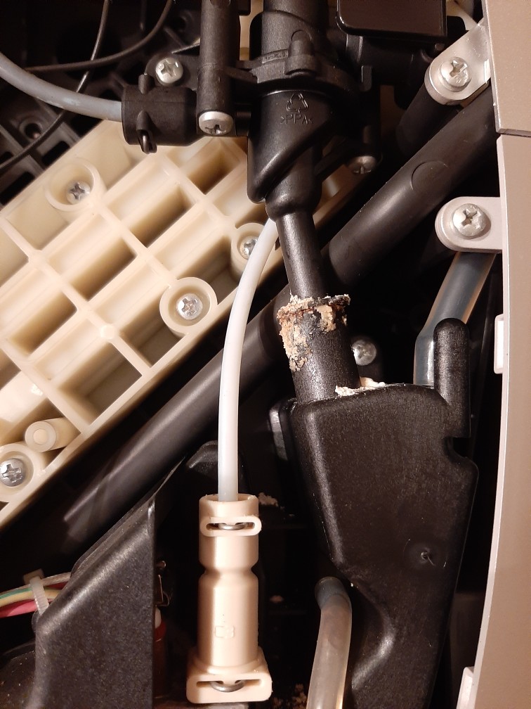 Ich weiß, daß dieses Thema schon behandelt wurde, bin mir aber dennoch unsicher. Seit einiger Zeit steht unter der KM immer wieder Wasser und die Auffangtasse ist sehr schnell voll. Soweit ich beobachtet habe, rinnt nur während des Brühvorganges Wasser in die Schale bzw. darunter. Ich habe öfter gelesen, das meist der Brühkolben ersetzt werden muß. Gestern habe ich die Maschine zerlegt und die Stelle gefunden, wo vermutlich das Wasser austritt - siehe Fotos. Es sieht für mich nicht so aus, als ob da der Brühkolben beteiligt wäre!? Was meint Ihr? Was soll ich ersetzen?