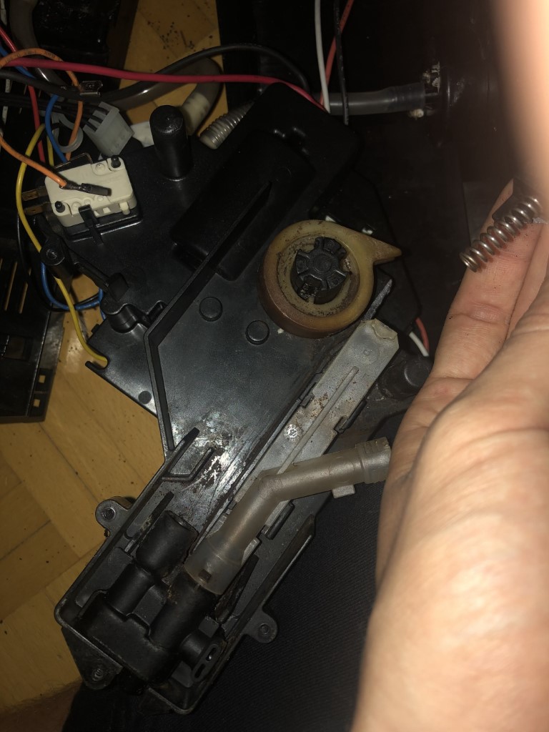 Mein Gedanke war, dass der Mikroschalter defekt ist, also habe ich das Gerät aufgemacht und den Antrieb ausgebaut. Dabei ist mir die Feder vom Drainageventil entgegengekommen und ein Teilchen vom Antriebsgehäuse auf dem das DV sitzt war abgebrochen-siehe Bilder (vermutlich das Knacken während der Initialisierung).