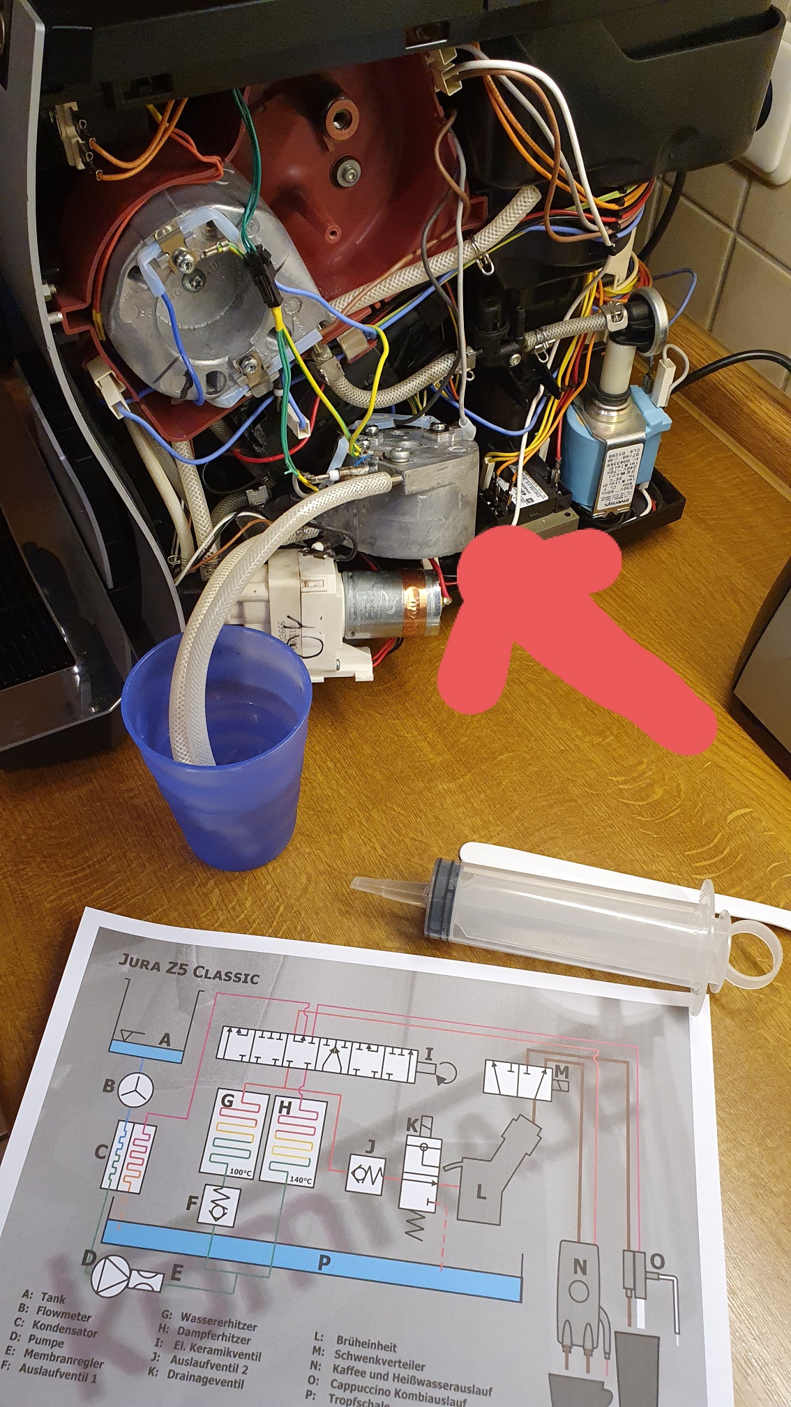 Jetzt habe ich den TB Dampf ausgebaut und versucht mit Entkalker durchzuspülen. Trotz einer Spritze mit der man etwas Druck erzeugen kann, bekomme ich keinen Entkalker durch. Beim TB links kann ich ohne Probleme Entkalker durch pusten mit der Druckspritze.