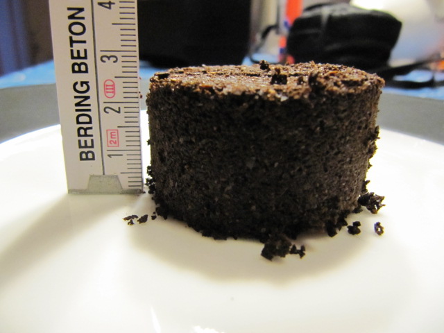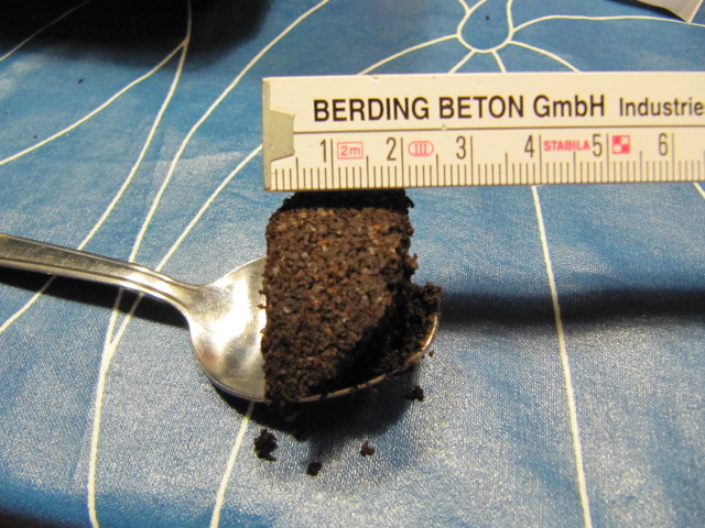 Wenn ich dann aber meine Spezialkaffeetaste drücke, dann kommt ein lascher Kaffee und der Tab zerbröselt fast. Ich konnte ein Teil einmessen und ist ca. 15 mm stark.