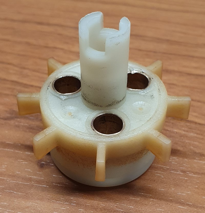 Nach nochmaligem Ausbau und Zerlegung des Mahlwerks haben wir festgestellt das das Kunststoff-Teil mit den 9 Flügeln, und in dem sich die drei Federn befinden (Rutschkupplung) und die darunter sitzende Filz-Dichtung zerstört wurden.
