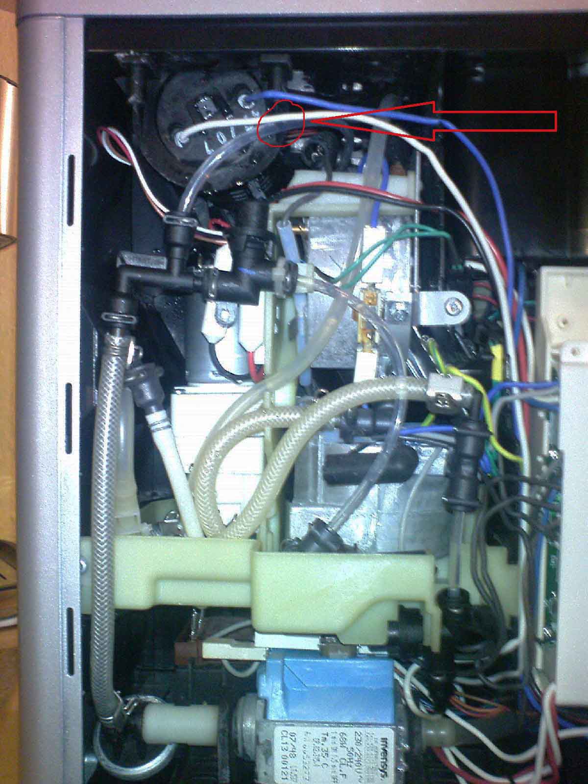 habe den Übeltäter gefunden. Es handelt sich um einen durch gescheuerten Schlauch - siehe angehängte Bilder. Er hat sich wohl durch die stetigen Vibrationen an einer Kante des Gehäuses des Antriebes der Brüheinheit durch gescheuert. Ist irgendwie blöd verlegt. Ich kann die Abbildung in den Serviceanleitungen leider nicht 100% mit den Verbindungen in meiner Maschine zusammenbringen. ?(