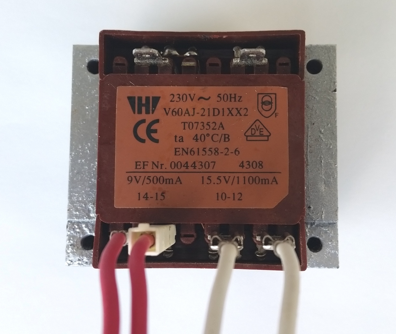 Die beiden Trafos sind vollkommen baugleich (2 dickere Anschlussstifte mit 15,5V / 1100 mA und 2 dünnere Anschlüssstifte mit 9V / 500 mA) - so weit so gut.