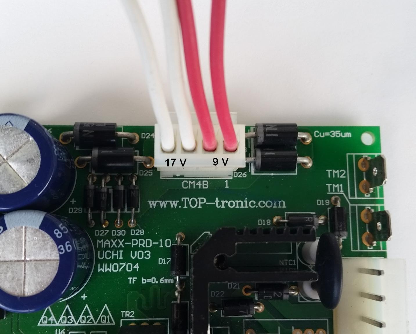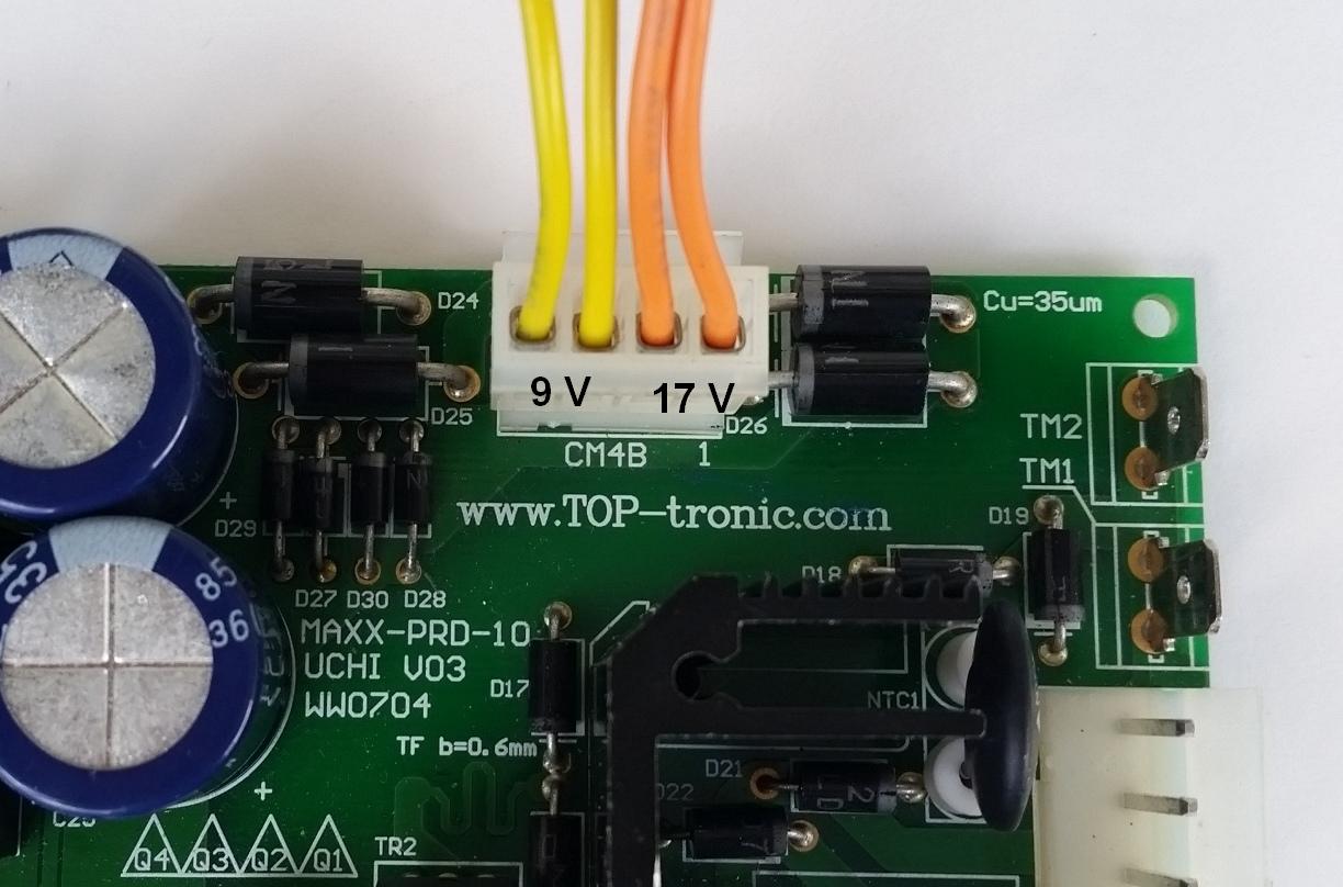Während beim Kabelbaum mit den orangen und gelben Leitern die höhere Spannung an die Pins 1 und 2 und die niedriger Spannung an die Pins 3 und 4 des Printsteckers gelegt wird, ist es beim Kabelbaum mit den roten und weißen Leitern genau umgekehrt.