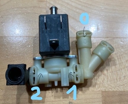 Die Zahlen finden sich jeweils an den markierten Stellen. Wenn ich nun bei "0" oder dem nicht definierten Eingang reinblase, kommt die Luft am Überdruck raus. Wenn ich am mit Nr 2 markierten schwarzen Ausgang (zur Heißwasserdüse) reinblase, geht nix. Für gewöhnlich sollte das so richtig sein.....