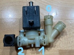 4. Da die Stromanschlüsse vom Ventil im eingebauten Zustand sichtbar sind, ist folgerichtig der Anschluß "1" auf der rechten Seite, wo das Wasser von der Brühgruppe / Dampferhitzer in das Y-Stück läuft. Demnach ist die 2 der Auslauf zur Heißwasser-/Milchschaumdüse (der schwarze 90 Grad Raccord)