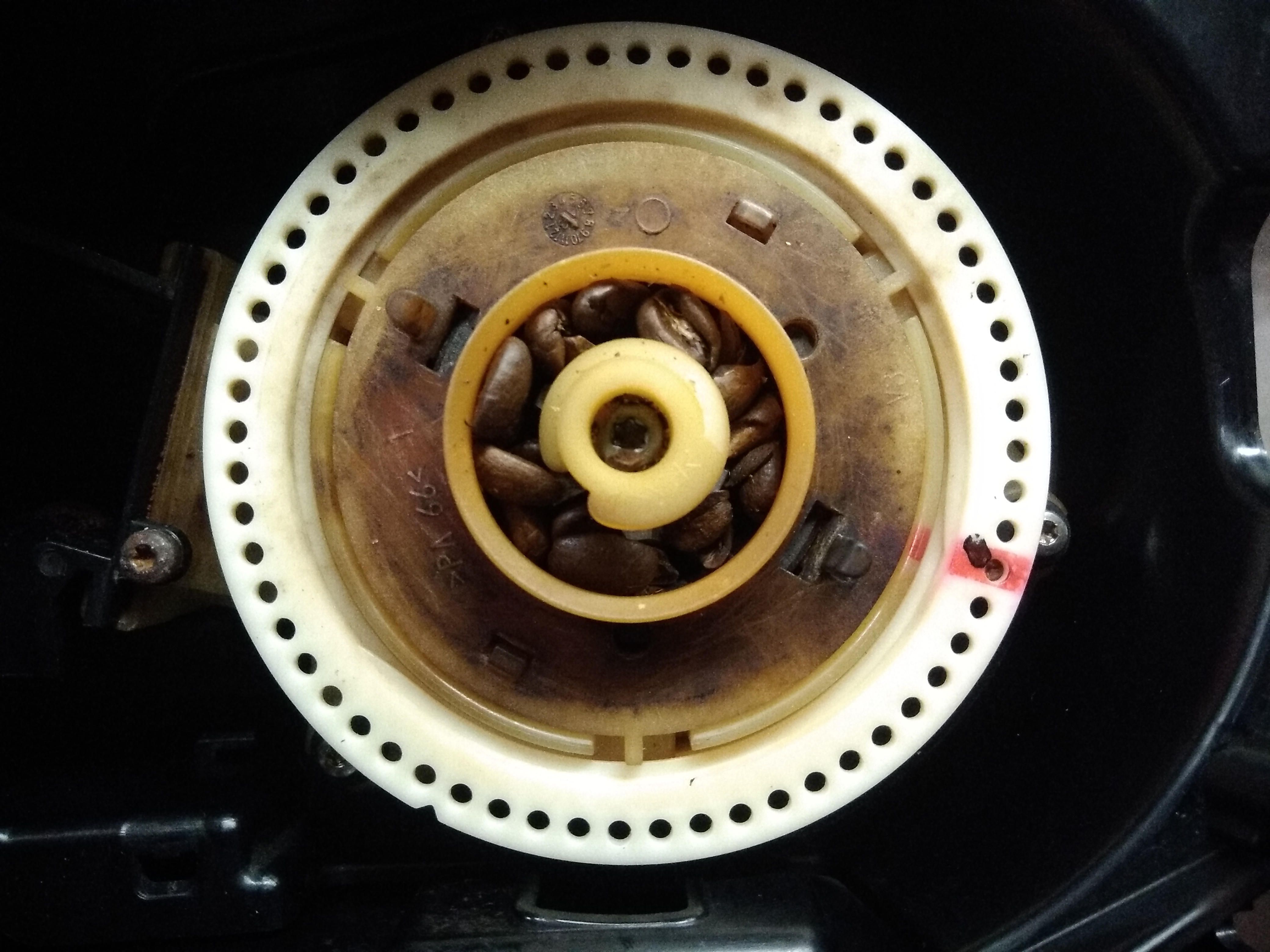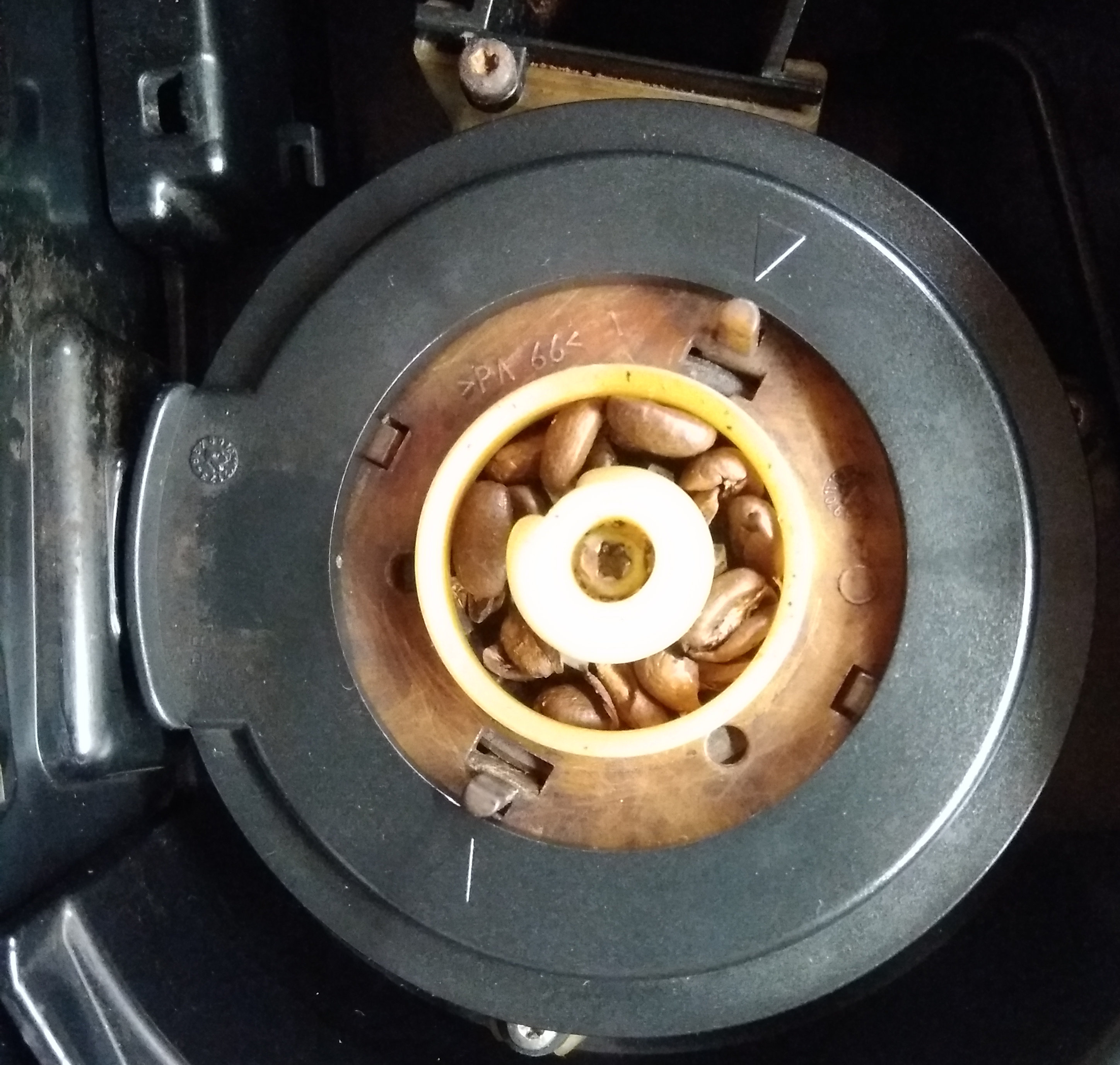 Ich würde als nächstes zur Sicherheit die graue Fahne oben an der Brüheinheit kontrollieren. Die betätigt nämlich den Mikroschalter für die Mahlmengenerkennung. Da ist zwar selten was, aber zur Sicherheit sollte man mal schauen, ob die fest und gerade sitzt.