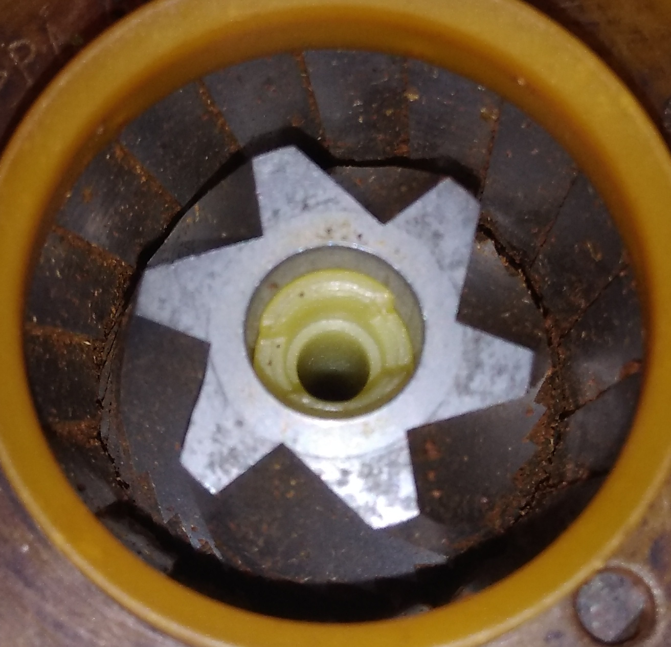 Ja, mein Handy mit seiner Kartoffelkamera ist da etwas herausgefordert, und hernach ich mit meinen mäßigen Bearbeitungskünsten und der 1MB-Grenze sicher auch. Kann auch die Restfeuchte in den Bohnen bzw. spezifisch dieser Charge von Bohnen zu diesem stückigen Rieseln führen? Sicherheitshalber hatte ich das Mahlwerk nochmal komplett zerlegt, gereinigt und wieder zusammen gesetzt. Danach ist das Mahlergebnis jetzt wieder sichtbar grobkörniger, der Puck zerfällt jetzt auch beim Auswurf.