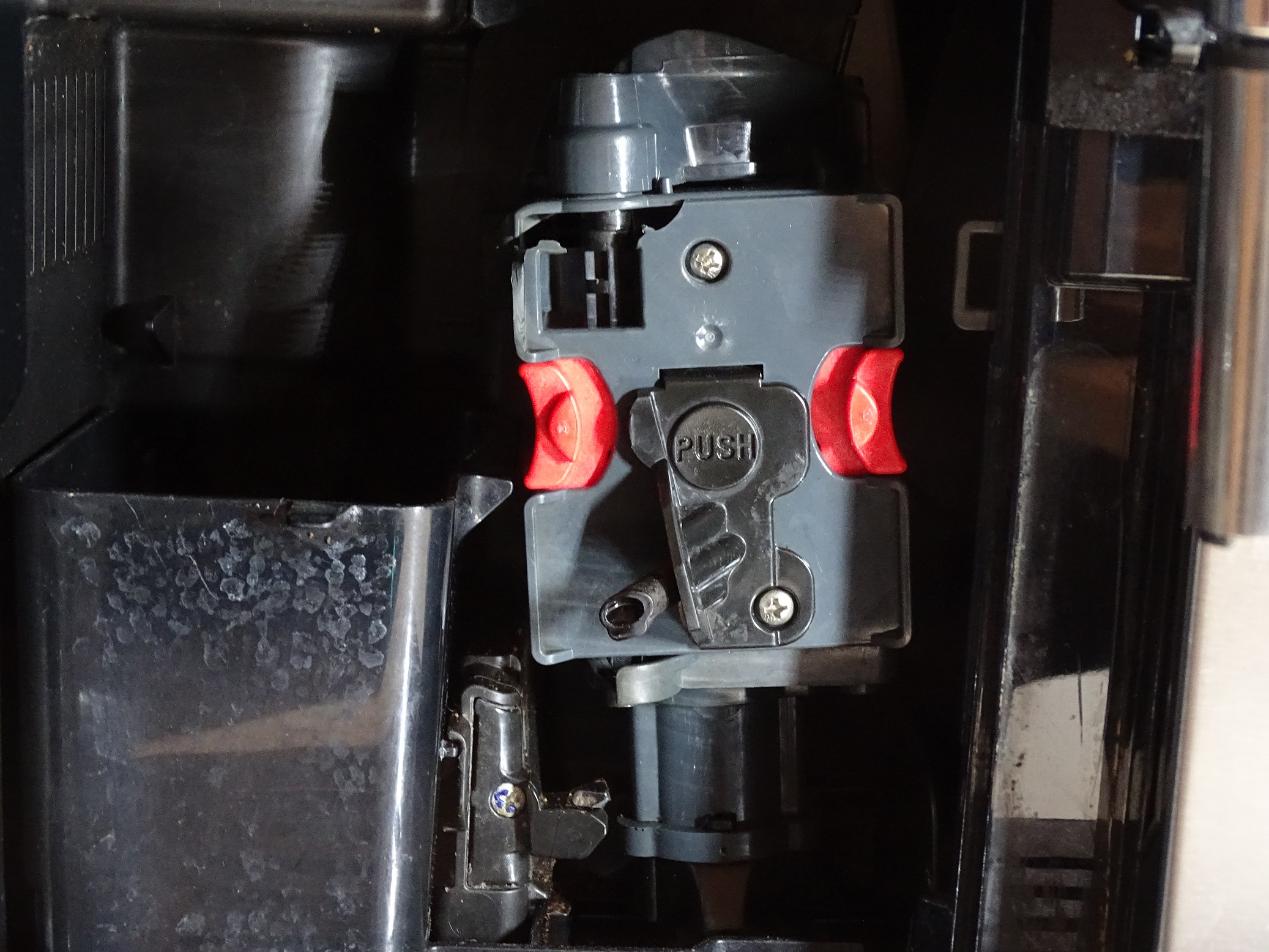 Ich öffnete die Frontklappe und erkannte dass die Einheit zu weit Runter gefahren ist, ich habe alle Kabel X mal überprüft ob sie richtig sind und alle Vorschläge die ich in Forum über endschalter und redschalter finden konnte nachgelesen. Da die Brüheinheit im Inneren sehr Verschmutzt war vermutete ich das dadurch der Obere endschater fast sitzt. Ich habe eine Neue Brüheinheit eingebaut dabei ist auch logischer weise der Endschalter Oben ersetzt worden.