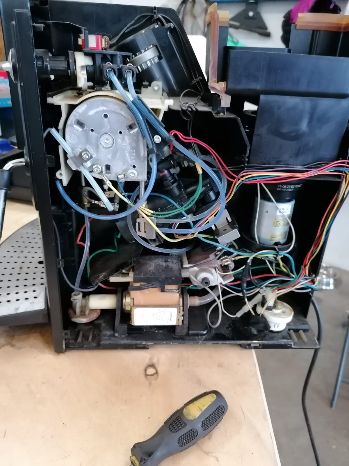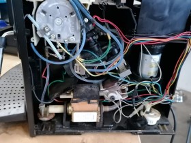 Das Problem dürfte sein das beim Vorbrühen der untere Kolben noch nicht in Position ist und das Wasser vom drainageventil schon raus spritz und sich in der ganzen Maschine verteilt