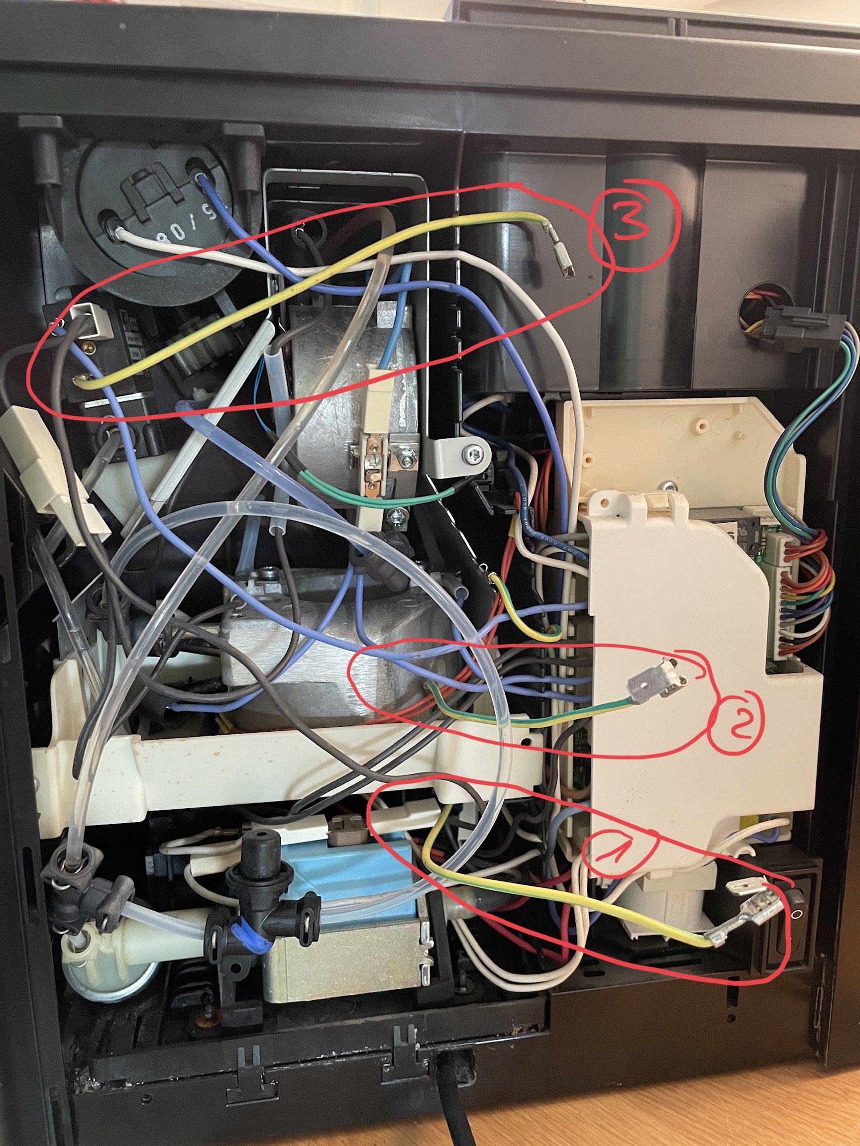 Also ich habe nacheinander die Schutzleiter entfernt in der Reihenfolge 1,2,3 -> siehe Foto.