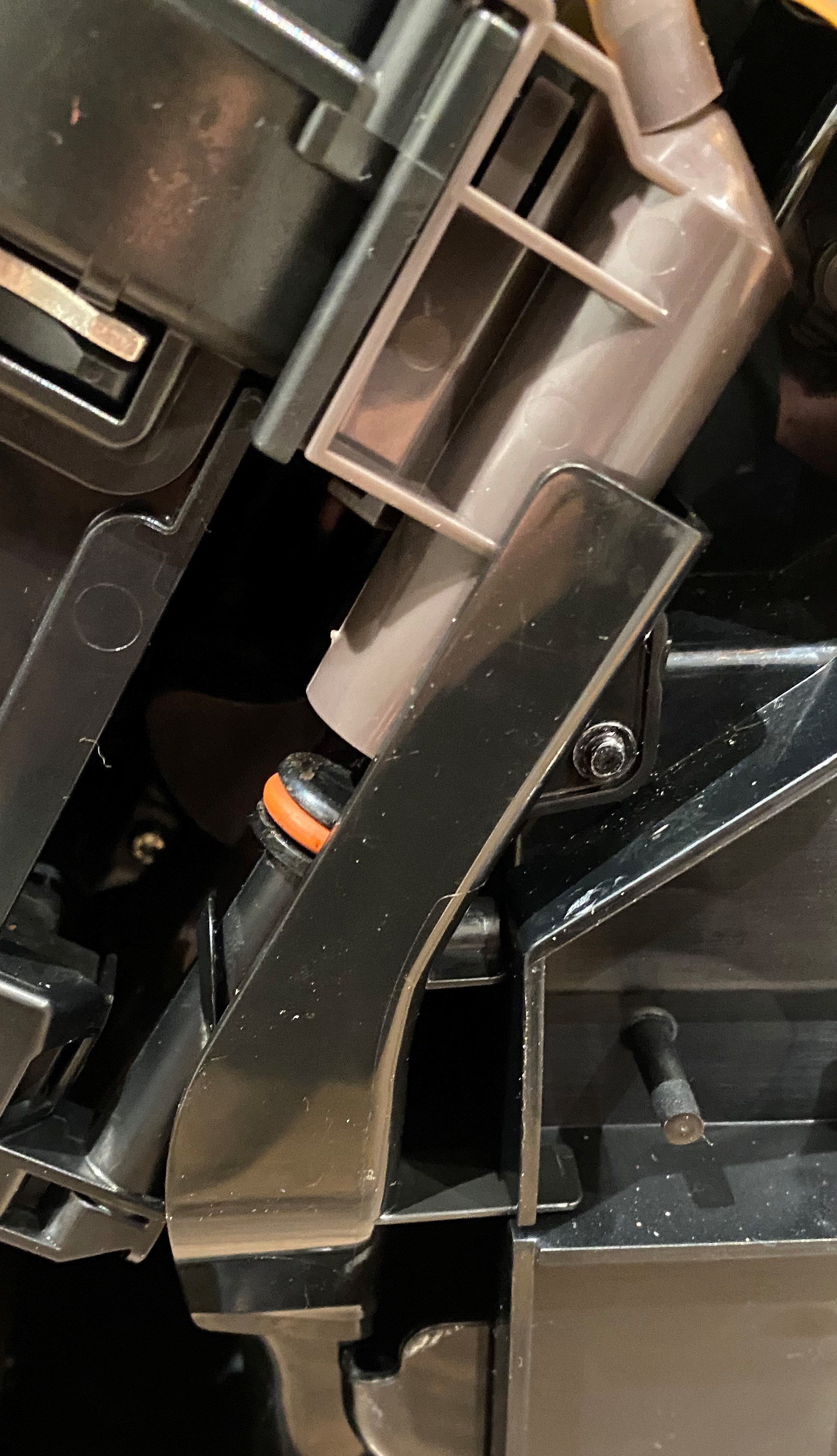 Fazit, es war nicht angeschraubt, scheint beim Abmachen der Abdeckung dann direkt mit weggefallen zu sein, sodass ich gar nicht sehen konnte, wo es angebracht war. Die Verkleidung muss nun mit einer Schraube weniger auskommen, da ich eine Ovalkopfschraube zweckentfremdet habe, um das Wasserableitteil anzuschrauben.
