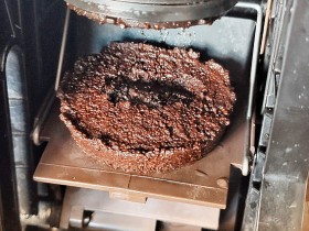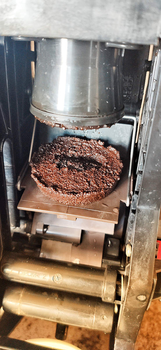 das dosierte Kaffeemehl wurde noch hörbar angedrückt, Wasserpumpe lief an und wurde sofort abgebrochen, bei vorsichtigem Ziehen der Brüheinheit, lag der Trester-Puck wässrig aber geformt auf der Klappe der Brüheinheit.