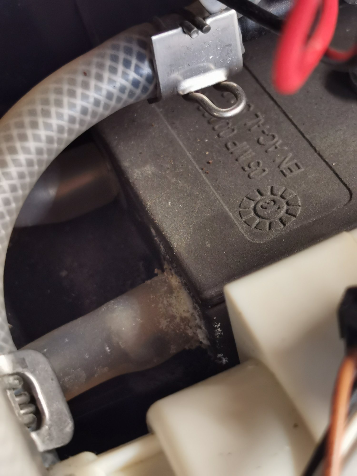 DV war (außen) total mit Trester zu => zerlegt, gereinigt, neue Dichtungen eingebaut (das blaue Premiumset, 2x Formdichtung, 2x O-RInge "klein", 1x O-Ring "dünn"). Formdichtung nach Anleitung flache Seite sichtbar.