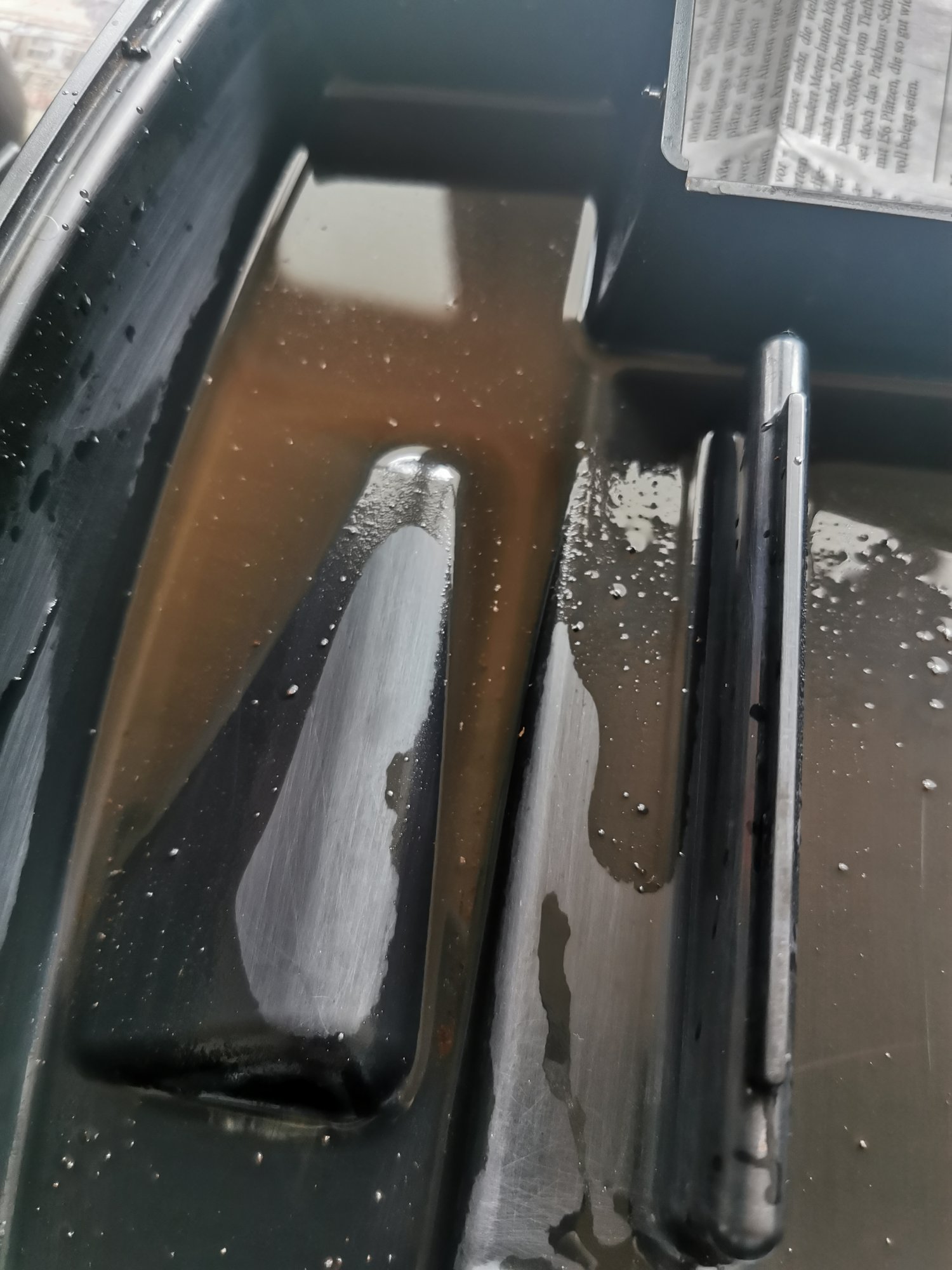 Alles Wasser läuft in die Auffangschale (heiß, dampfte noch). Also bis zum Erhitzer passt alles.