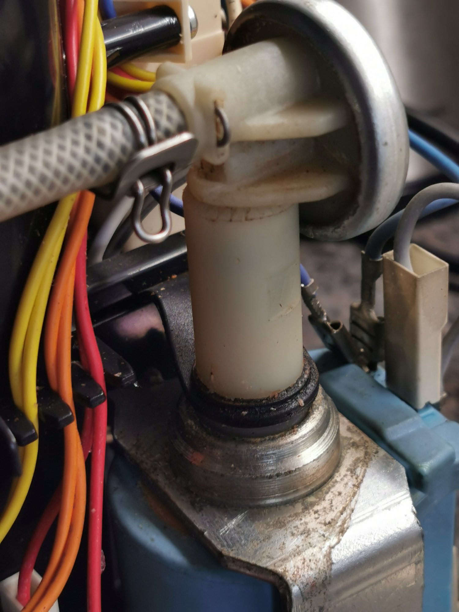 DV war (außen) total mit Trester zu => zerlegt, gereinigt, neue Dichtungen eingebaut (das blaue Premiumset, 2x Formdichtung, 2x O-RInge "klein", 1x O-Ring "dünn"). Formdichtung nach Anleitung flache Seite sichtbar.