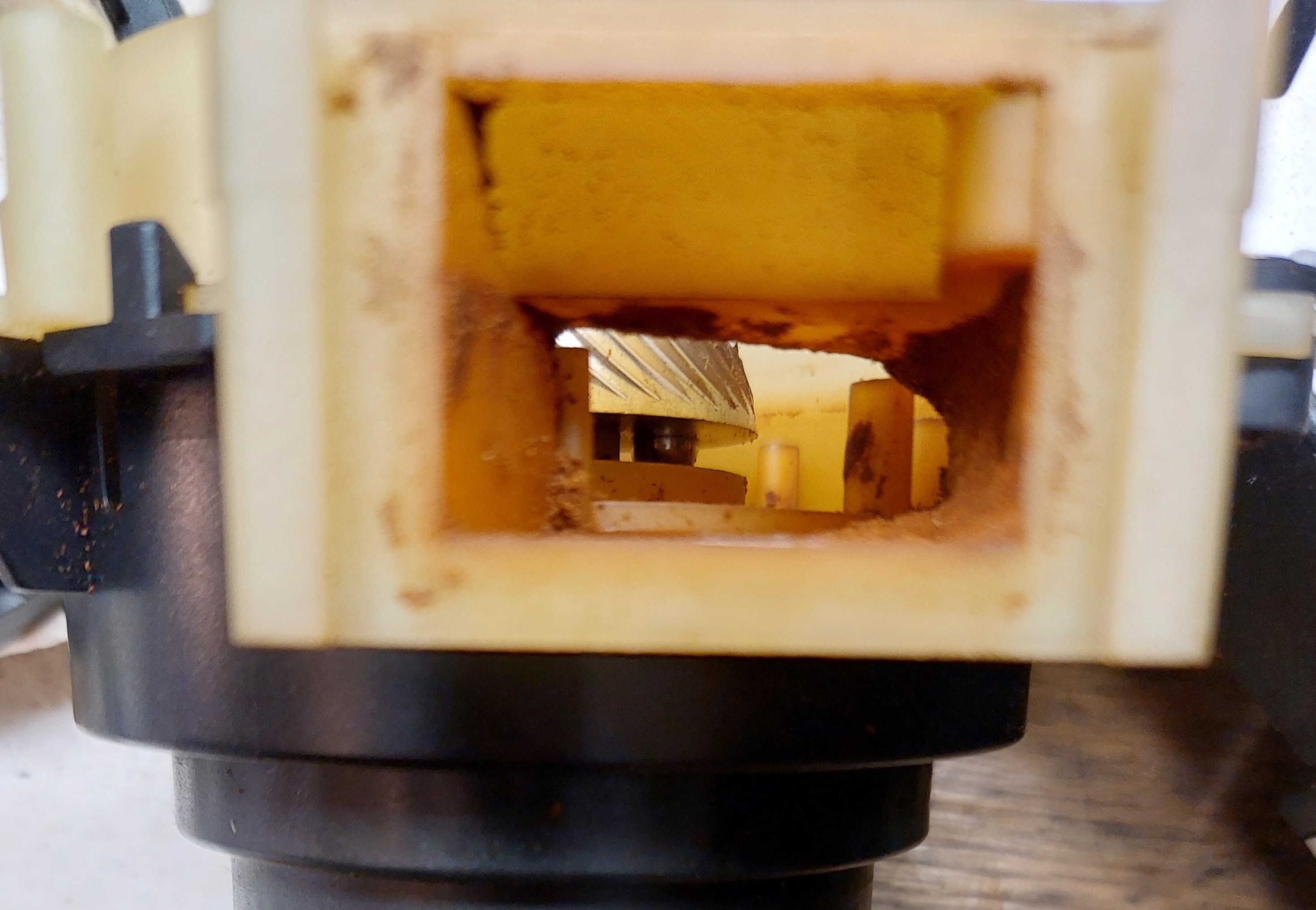 Zuerst habe ich gedacht, dass ich wohl die Schraube stärker anziehen muss, aber dann habe ich festgestellt, dass der Zwischenraum zwischen der oberen Förderschnecke und dem unteren Teller durch die Kunststoffformteile vorgegeben ist, da hilft auch nicht, die Schraube mehr anzuziehen. Auf dem alten Mahlkegel war noch eine Scheibe, aber die ist ja recht dünn, die füllt nicht den zwischenraum, da bräuchte ich eher einen Ring mit ca 2mm Dicke.