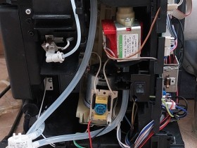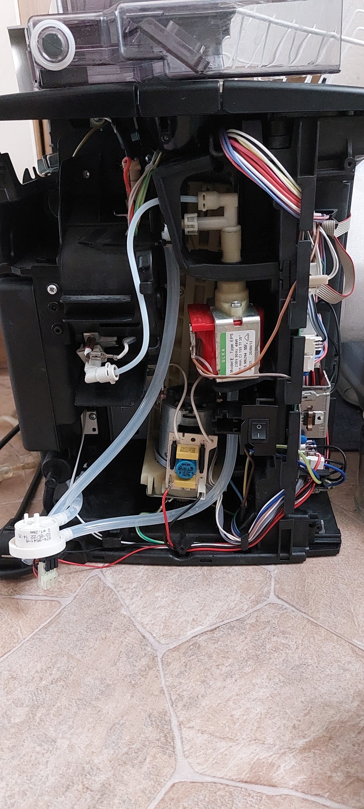 Also das Gehäuse geöffnet und nach dem Fehler gesucht. Hinten am Brühkolben, denke es ist der Brühkolben, war ein Winkelstück vom Schlauch defekt, an der Schweißnaht gerissen, da kam heißes Wasser unter hohem Druck raus. Der Riss war schon leicht schwarz, scheint ein älterer Defekt zu sein.