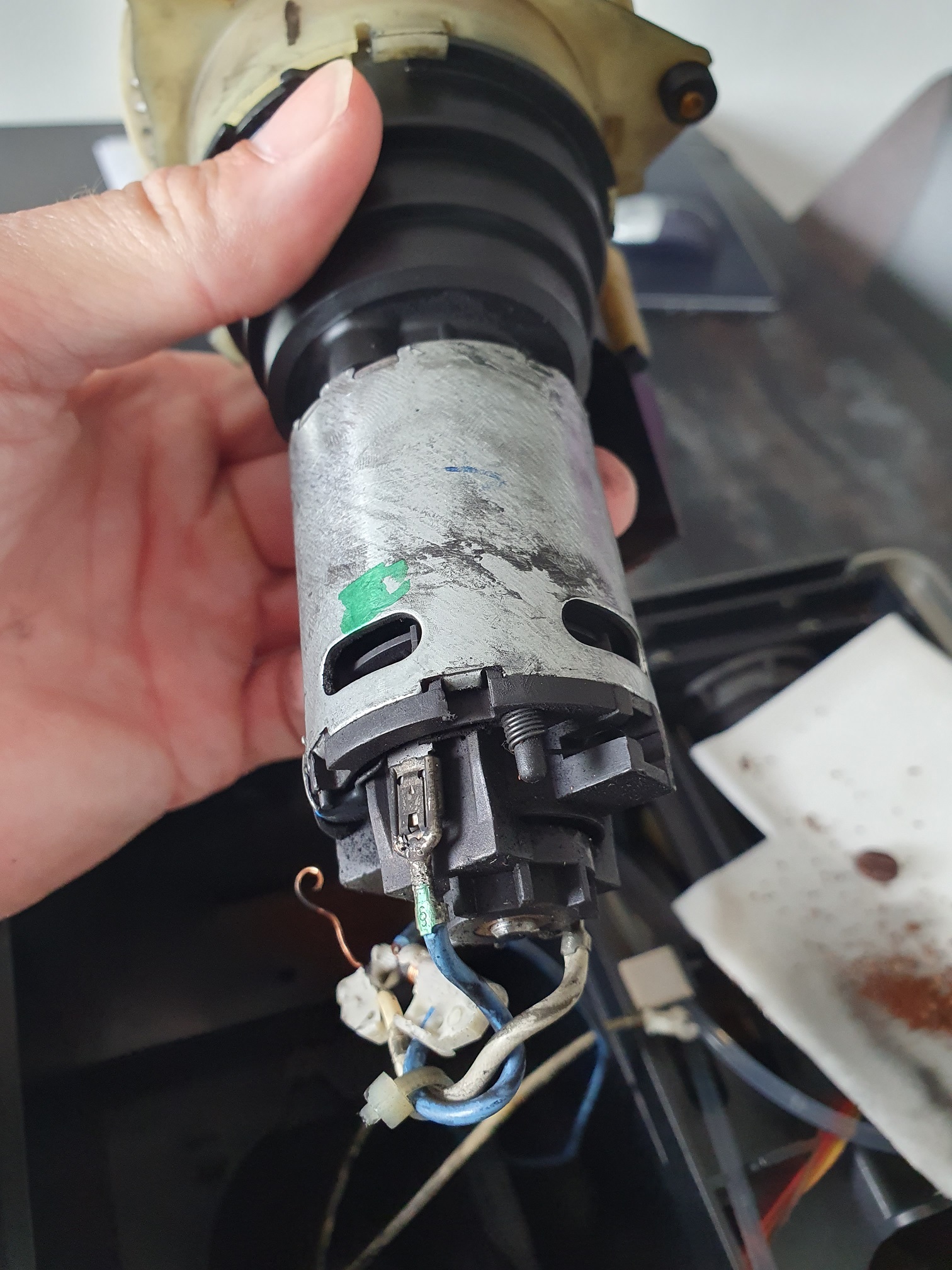 ich hoffe, es geht euch allen gut. Leider hat meine Jura S9 Impressa heute ihren Dienst aufgrund eines elektrischen Kurzschlusses verweigert. Beim Kaffeemahlen hörte ich ein kurzes Klacken, danach blockierte das Mahlwerk und die Sicherung wurde ausgelöst. Nachdem ich das Mahlwerk ausgebaut habe, konnte ich das folgende Bild festhalten (siehe Anhang). Ich frage mich, ob möglicherweise ein Fremdkörper wie ein Stein die Ursache sein könnte oder ob das Getriebe selbst die Blockade des Motors verursacht hat. Es scheint auf jeden Fall so,als ob sich der Motor selbst gedreht hat, samt seinem Anschlusskabel.