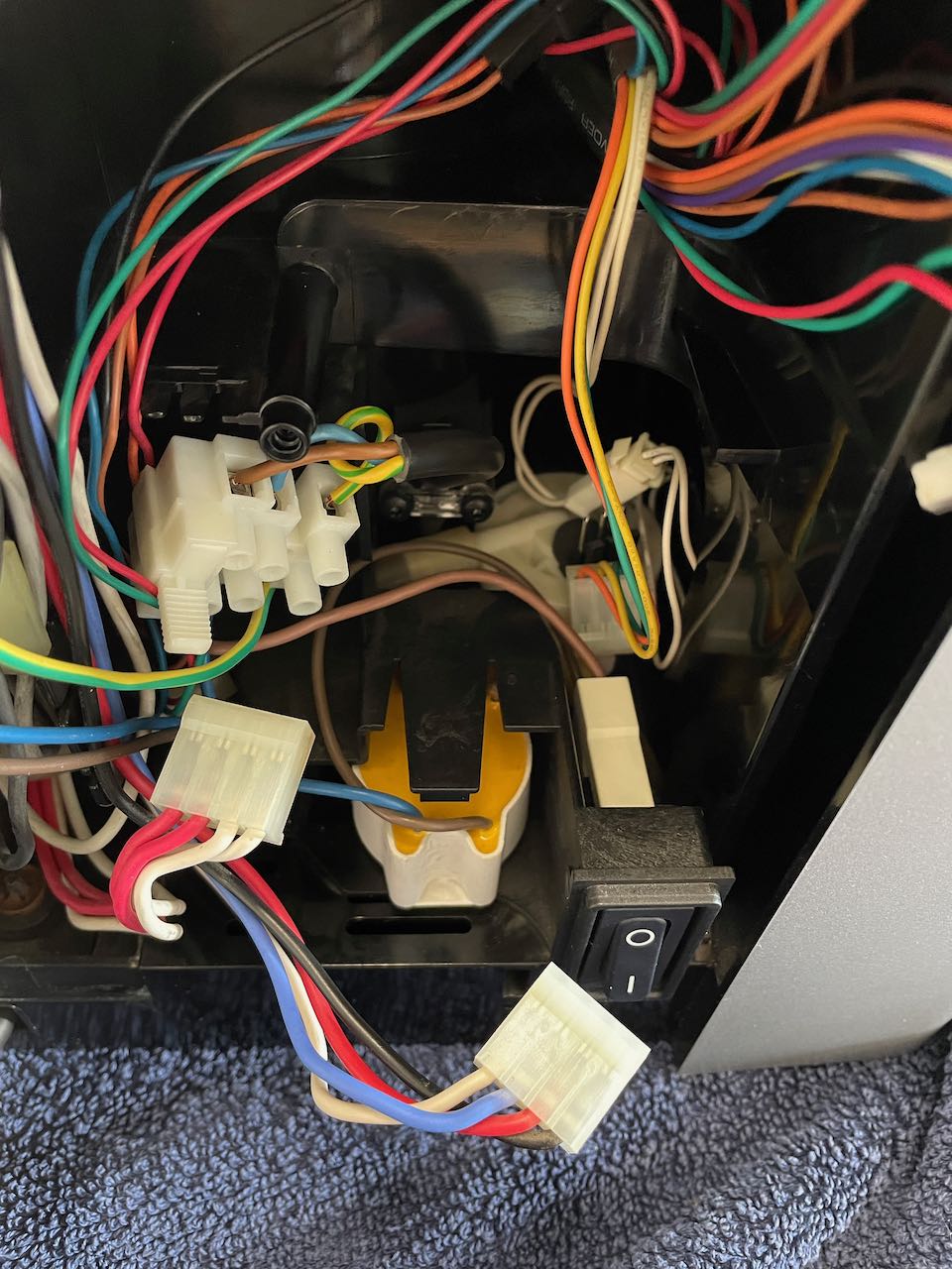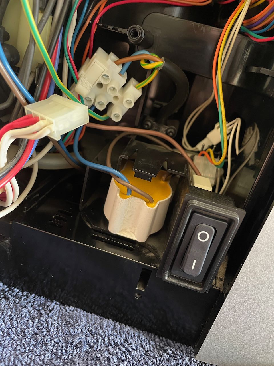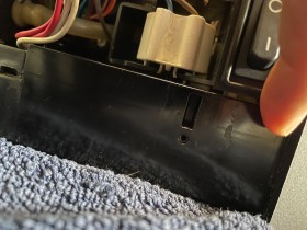 Vor dem Flowmeter ist eine Art Plastikaufhängung, die den Stromschalter und ein weiteres elektronisches Bauteil trägt. Trotz Lösen der entsprechenden Schrauben scheint es allerdings keine Möglichkeit zu geben, dieses Plastikteil da rauszubekommen, ohne es zu beschädigen. Unter dem Plastikteil sind kleine Füßchen, die in Schlitze im Gehäuse ragen. Im Internet leider keinerlei Informationen zu diesem Modell.