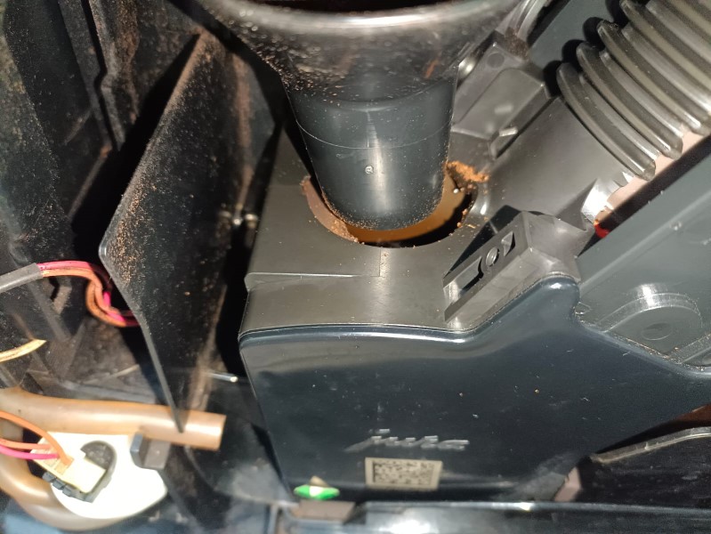 Man sieht deutlich, dass der untere Kolben nicht optimal positioniert ist und so Kaffeepulver nicht richtig/mittig in die Brühkammer fallen kann – dadurch fällt meist etwas daneben und/oder der Brühzylinder wird einseitig gefüllt. In Folge mehr Pulverrückstände im Gerät und auch durch die einseitige Füllung Probleme bei der Getränkequalität.