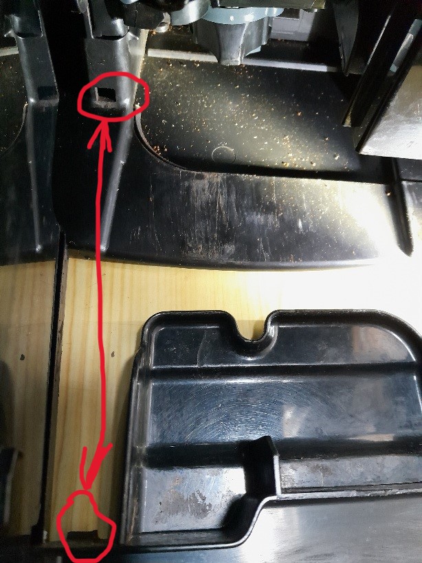 Ich glaube auch nicht, dass es an dem abgebrochenen Stift der Tropfschale liegt - Bild unten. Dieses Kunststoffteil ist mir schon vor Jahren abgebrochen - das hat der Funktion der Maschine aber bisher nicht geschadet - ich vermute, dass an der Stelle bei diesem Modell gar kein Näherungsschalter montiert ist. Habe jetzt ersatzweise ein Stück eines Kabelbinders in die Öffnung gelegt - das hat aber auch nichts geändert.