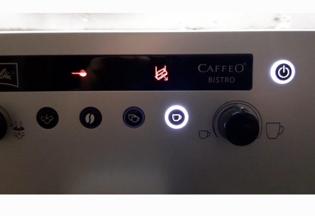 Nach dem einschalten leuchtet immer noch dauerhaft die Tresterleuchte. Zusätzlich leuchtet dauerhaft die Kaffeebezugstaste und BLINKEN tut jetzt noch die Ein/Austaste UND die Lampe vom Pulverdeckel…???