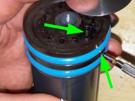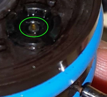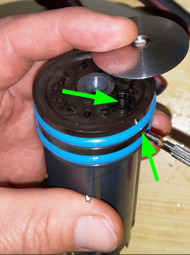 Bei Reinigungsversuchen bin ich dann auf den kleinen "Ventilstift" (grüner Kreis unten) gestoßen.